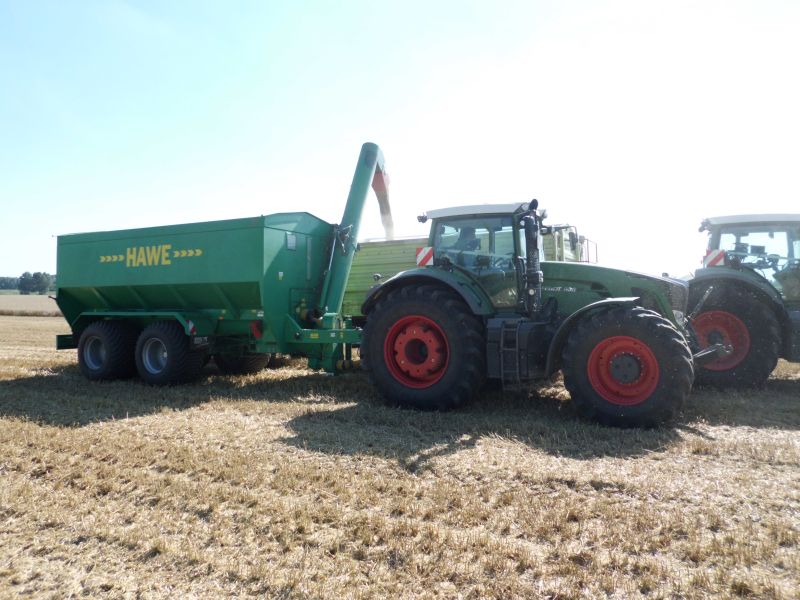 Der Weizenschlag auf dem die Bilder entstanden war 85 ha groß und gedroschen wurde Donnerstag ab 19:00 Uhr und Freitag von 10:00 bis 21:00 Uhr. Danach war alles Geschichte. Ich bin im Wechsel mit dem 512er und dem 930er abgefahren und da die Annahmestelle nicht sehr weit entfernt war gab es auch keinen Stillstand.