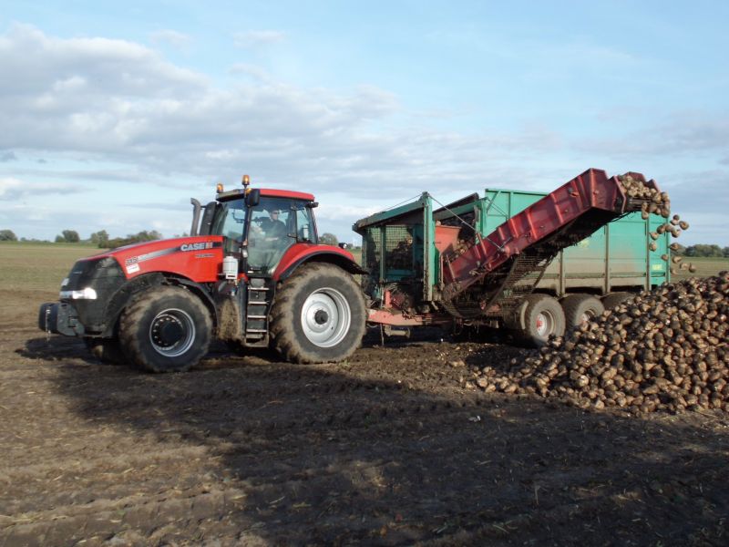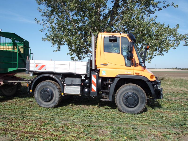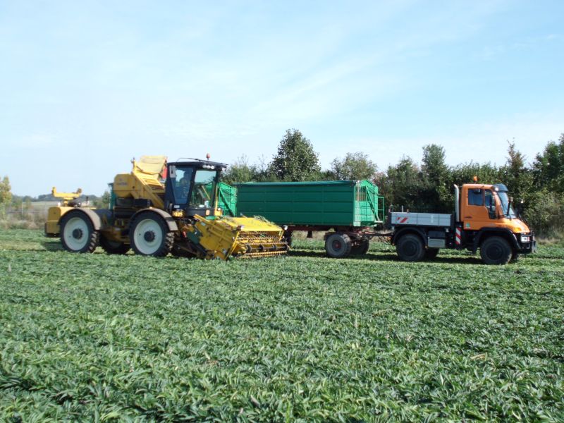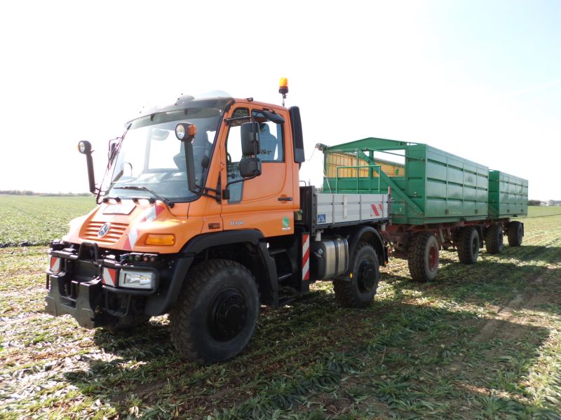 Der Unimog ist ein 400er. Der Betrieb hat ihn vor ca. 4 Wochen als Vorführer recht preiswert erworben (deshalb auch die Farbe). Die Ausstattung ist ziemlich mager (nur Heckzapfwelle, Winterdienstplatte und fünf Steuergeräte). Er wurde auf 60 km/h gedrosselt, um ihn auch mit der Klasse T fahren zu können. Die Ausstattung war für den Betriebsleiter wohl eher zweitrangig. Hauptsächlich wollte er eine Alternative für die vielen Transportaufgaben im Betrieb, die gegenüber dem Traktor Sprit und Reifen spart. So befand er sich denn gestern auch im direkten Vergleich mit dem abgebildeten John Deere. Beide hatten identische Hänger, die gleiche Transportstrecke und Ladung und am Abend sollte sich dann beim Betanken zeigen ob die Rechnung aufgeht. Auf der Pritsche war ein Betongewicht verzurrt, da sich der Mog beim Zwiebeltrtansport in der Vorwoche als etwas zu leicht erwiesen hatte. Leider habe ich vergessen zu fragen, warum er mit schwarzen Kennzeichen zugelassen wurde. Die beiden HW 80 Hänger verfügen über die kurzen Deichseln, die es optional auch schon zu DDR Zeiten gabe. Dennoch ist der Zug etwa 19 Meter lang und es musste eine Ausnahmegenehmigung beantragt werden.