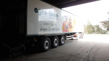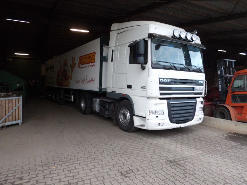 Am Montag und Dienstag war ich wieder auf Achse. Und zwar nicht mit einem Kipper, sondern mit einem der Bandwagen der Firma. Die Funtionsweise und Bedienung hatte ich mir im Sommer während einer Wartezeit schon einmal von einem Stammfahrer erläutern lassen. Deshalb entfiel am Montag früh eine zeitraubende Einweisung und ich lud am Firmenstandort erst einmal Zweibeln (40 - 60). Die auffällige Werbung auf dem Zug ist zwar nicht so mein Fall, aber ansonsten freute ich mich auf diese neue Herausforderung. Nach dem Laden ging es über die B 71 und B 4 zu einem Verarbeiter in der Nähe von Uelzen in der Lüneburger Heide.