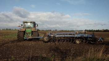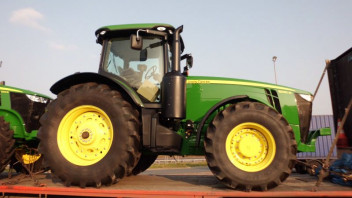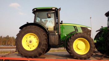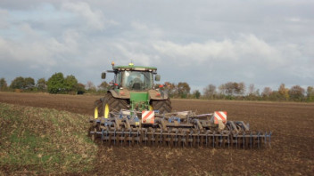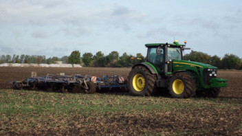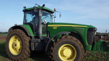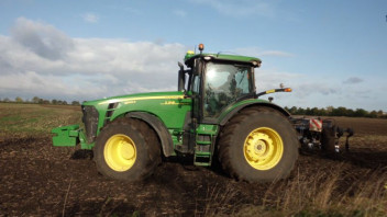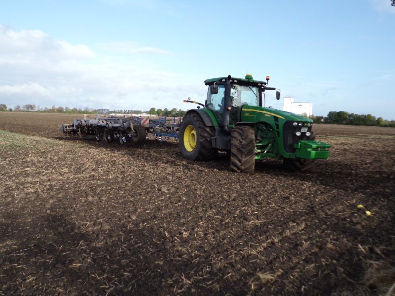 08.10.2011, vorbildlich bereifter JD 8345 R mit Köckerling Grubber in der Gemarkung Altenweddingen.