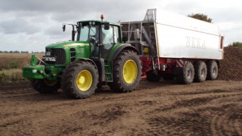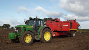 08.10.2011, Roden von Stärkekartoffeln durch den Betrieb "Schwanke" / Altenweddingen auf einem Schlag in der Gemarkung Schwaneberg. Im Einsatz zwei identische Rodergespanne (JD 7530+ Grimme SE 150-60) und zwei BEKA Wannen hinter JD 7530 bzw. 7930.