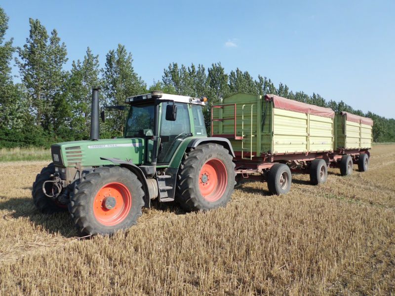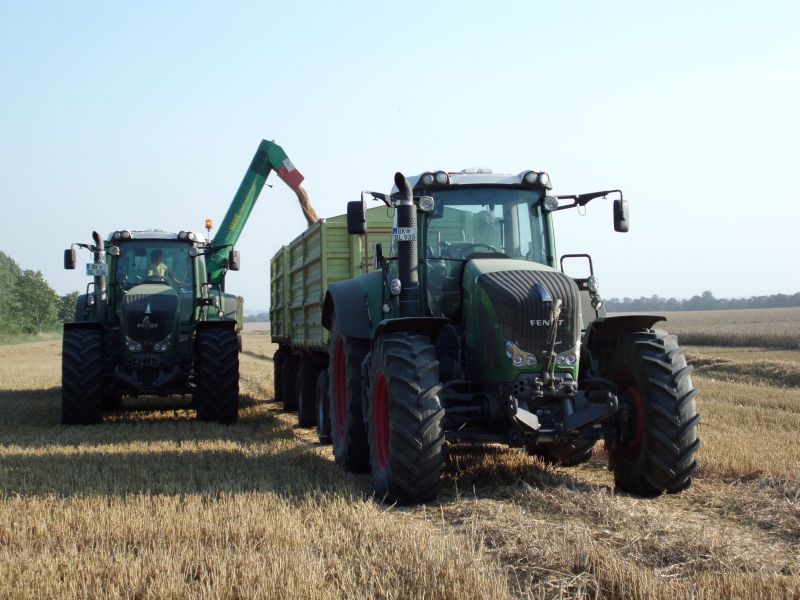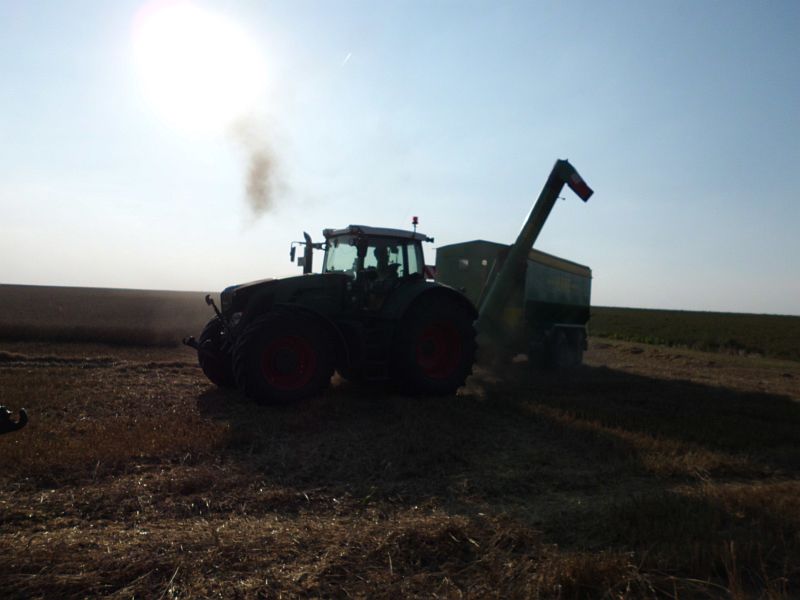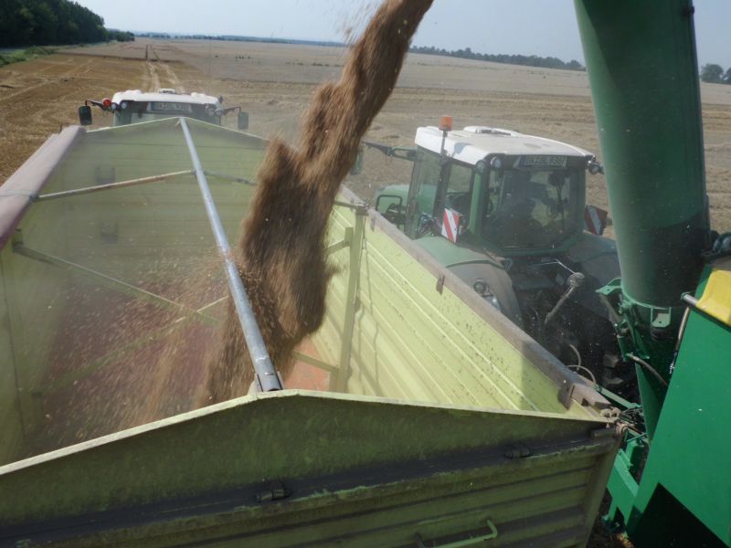 Der Weizenschlag auf dem die Bilder entstanden war 85 ha groß und gedroschen wurde Donnerstag ab 19:00 Uhr und Freitag von 10:00 bis 21:00 Uhr. Danach war alles Geschichte. Ich bin im Wechsel mit dem 512er und dem 930er abgefahren und da die Annahmestelle nicht sehr weit entfernt war gab es auch keinen Stillstand.