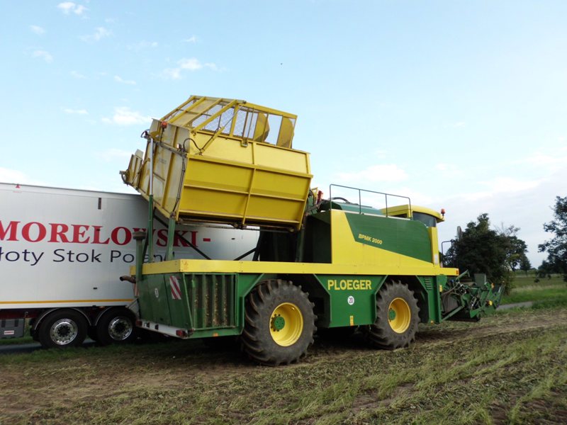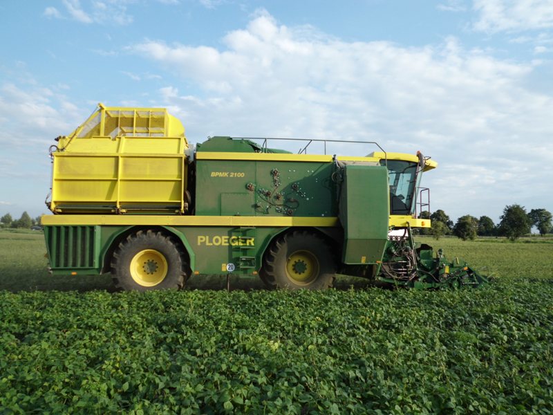 08.08.2012, Ernte von grünen Bohnen mit zwei identischen Ploeger BPMK 2100 in der Gemarkung Ebendorf, auf einem Schlag direkt an der BAB 2. Die Maschinen gehören einer Magdeburger Agrargenossenschaft, die damit auch Spinat erntet.