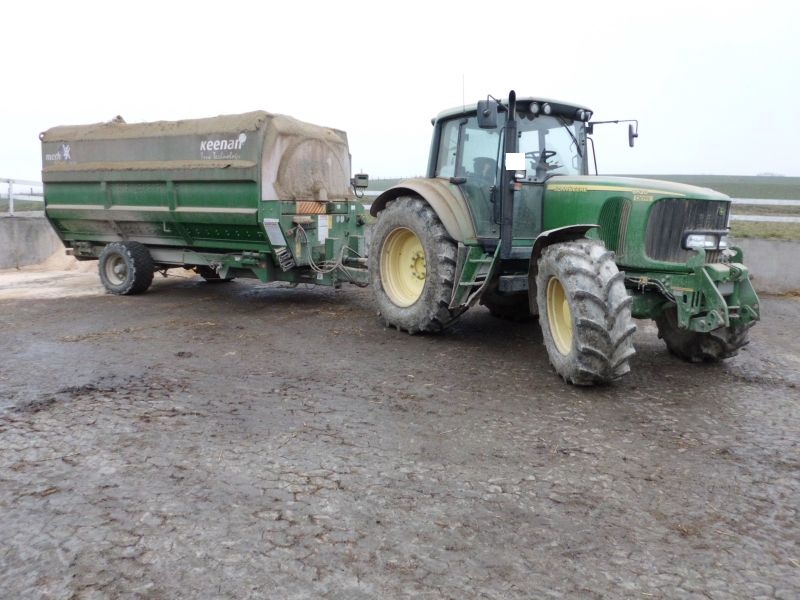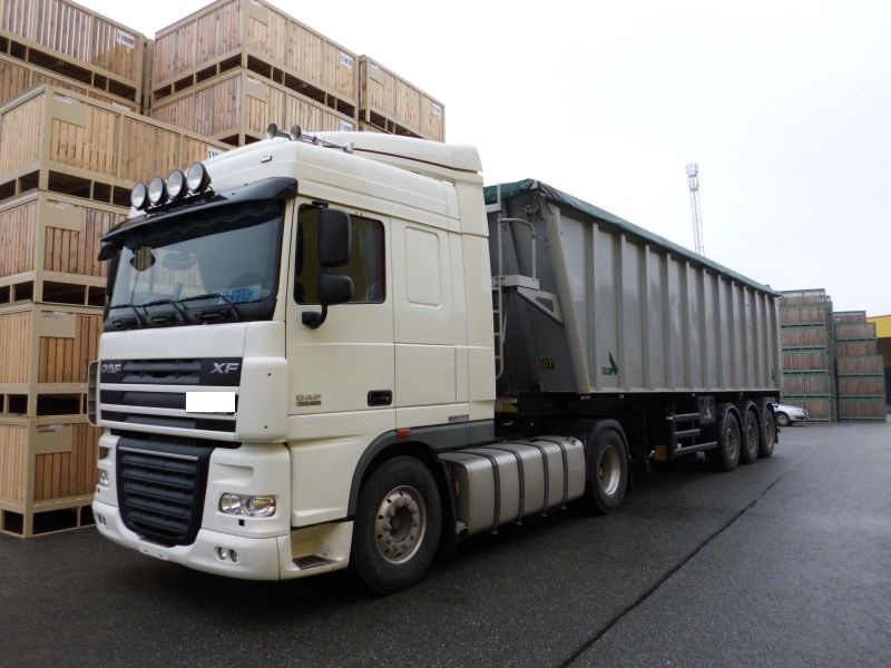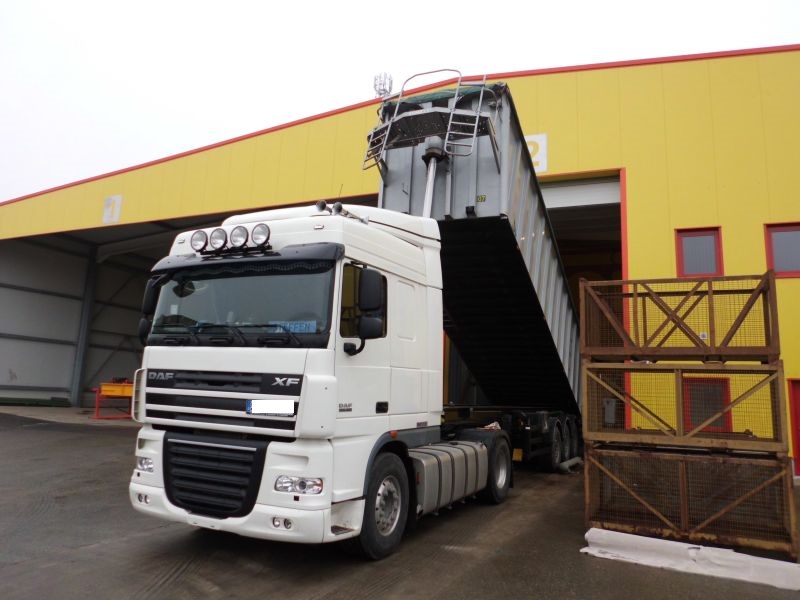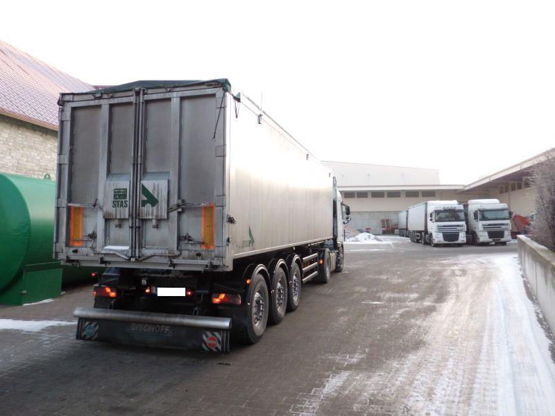 Da kurz vor mir gerade ein Zug Schrot angeliefert wurden war, musste ich mich etwas gedulden. Anschließend bat mich der (sehr freundliche ) Betriebsleiter parallel zum Feldweg, auf dem ich gekommen bin, auf seinem Hof Aufstellung zu nehmen und rückwärts an die Stelle zu schieben wo das Schrot lag. Der Untergrund war zwar fest aber nicht waagerecht. Nachdem der Stempel ca. 1 bis 2 Meter ausgefahren war, und noch nichts von der Ladung herausrutschte wurde mir die Sache mulmig. Der Landwirt beteuerte zwar, dass alle hier so kippen würden, aber das Schrot rutschte warscheinlich auch wie Wasser aus der Mulde. Mir kamen jedenfalls wieder youtube Trailer mit in Zeitlupe umkippenden Sattelzügen in den Kopf :o. Eine Holzbohle die lang und stabil genug wäre um die drei Aufliegerachsen in Waage zu bringen fand sich nicht, und so drehte ich den Zug um 90° und kippte dann ab. Das Kippen verlief gut, aber ohne Last auf der Triebachse war an der Steigung, auf dem schmierigen Untergrund an ein Fortkommen nicht zu denken. Radlader und Schlepper standen zwar bereit aber irgendwie hatte mich der Ehrgeiz gepackt. Also Sand vor die Antriebsräder, Schaltung auf manuell, Traktionskontrolle raus, Sperre rein und ganz sachte ging es nach dem Lösen der Feststellbremse vorwärts (ohne Reifen quälen).