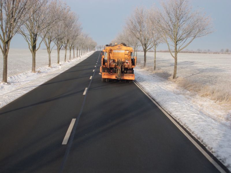 Dann war ich an der Reihe, gekippt wurde auf einen lange Bandkombination und es hat, wie schon beim Beladen, ziemlich gestaubt. Der Staub auf der Zunge ist zwar ein richtig leckeres Gefühl aber an den Klamotten und den Autos klebt er extrem. Danach wieder zurück in die Zuckerfabrik. Und es ist schon beruhigend so einen orangen Streuer vor sich zu haben .