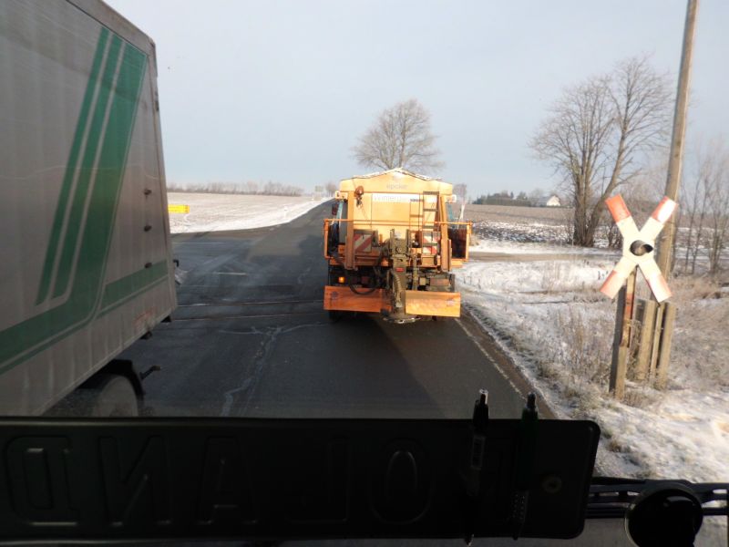 Die Verladespur in der Zuckerfabrik schien hauptsächlich für eine Waggonverladung geplant zu sein. Es sah so aus, als ob sogar eine Waage für Eisenbahnwaggons integriert war. Für LKW ist die Spur eine Sackgasse, je nach Windrichtung fährt man vorwärts rein und rückwärts raus oder umgekehrt. Zweitere Variante war etwas kniffelig, da aufgrund des beginnenden Gleisbettes der Platz, um den Zug vor dem Rückwärtsstoßen gerade zu ziehen, recht begrenzt ist. Aber ohne Zuschauer und mit etwas Ruhe hatte ich während der drei Touren keinerlei Probleme. Die Zeit der Beladung war ideal um eine passende Lenkzeitunterbrechung rein zu bekommen. Insgesamt ist jeder Zug drei Umläufe gefahren. Ich hätte gerne noch ein zwei mehr gemacht aber die Stammbelegschaft war froh, um die Mittagszeit in ihr wohlverdientes Wochenende zu gehen. Ein schöner Wintertag.........:D.