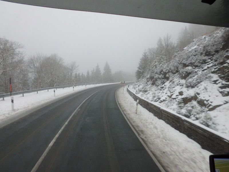 Auf meiner gestrigen Tour kam ein klein wenig "Ice Road Trucker" Feeling für Arme auf :D. Gestartet bin ich um vier Uhr am Firmensitz mit Roggen für die bekannte Brennerei in Nordhausen. Ich hatte mir den direkten Weg über die B 81, quer über den Ostharz ausgesucht. Dort lernte ich dann zum ersten Mal den Nutzen der Batterie an Zusatzscheinwerfern kennen, die ich bis dahin immer als Show abgetan hatte. Bei Steigungen und Gefällen bis 10 %, Temperaturen um den Gefrierpunkt und Lichtverhältnissen wie im sprichwörtlichen Bären.......sch war ich froh über die Dinger.