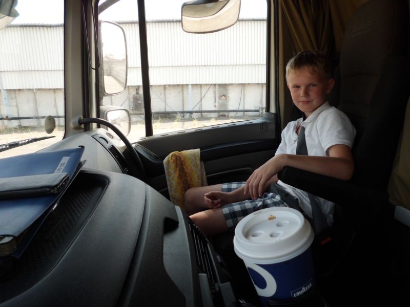 Stammfahrer dazu war der Kollege, an dessem Laster mir das bisher einzige kleine Mißgeschick in drei Jahren passiert ist. Da er inzwischen eine nagelneue Zugmaschine bekommen- , und den Schnitzer nicht vergessen hat, empfing mich ein freundliches Hinweisschild in der Kabine .