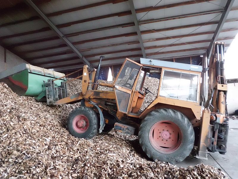 Fendt TS 80 Baggerlader und IHC 856 bei der Beschickung eines Holzvergaser BHKW in Dom-Esch, nahe Euskirchen in der vergangenen Woche.