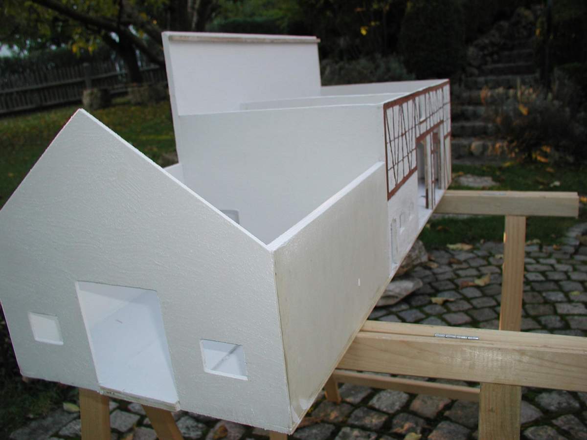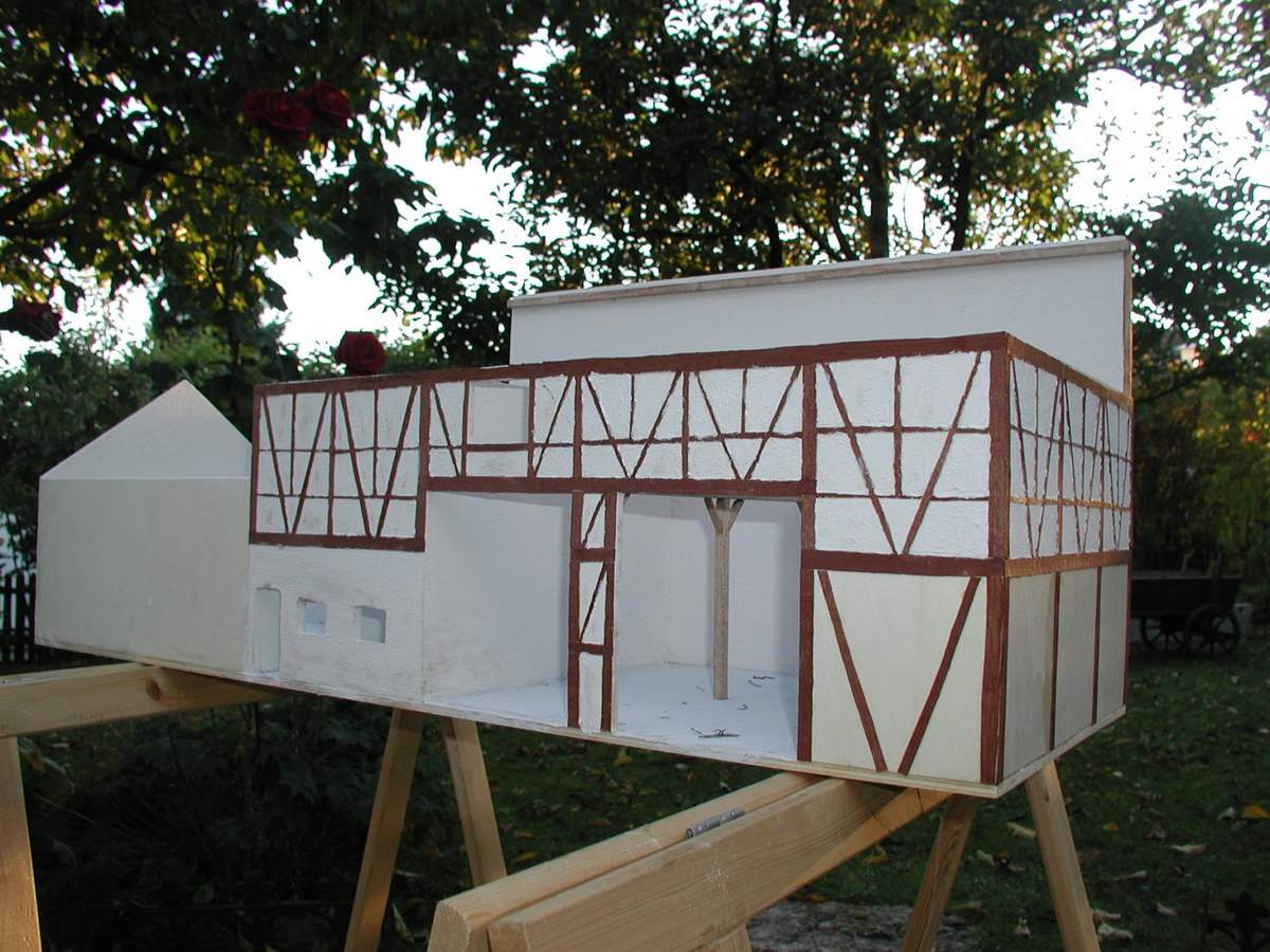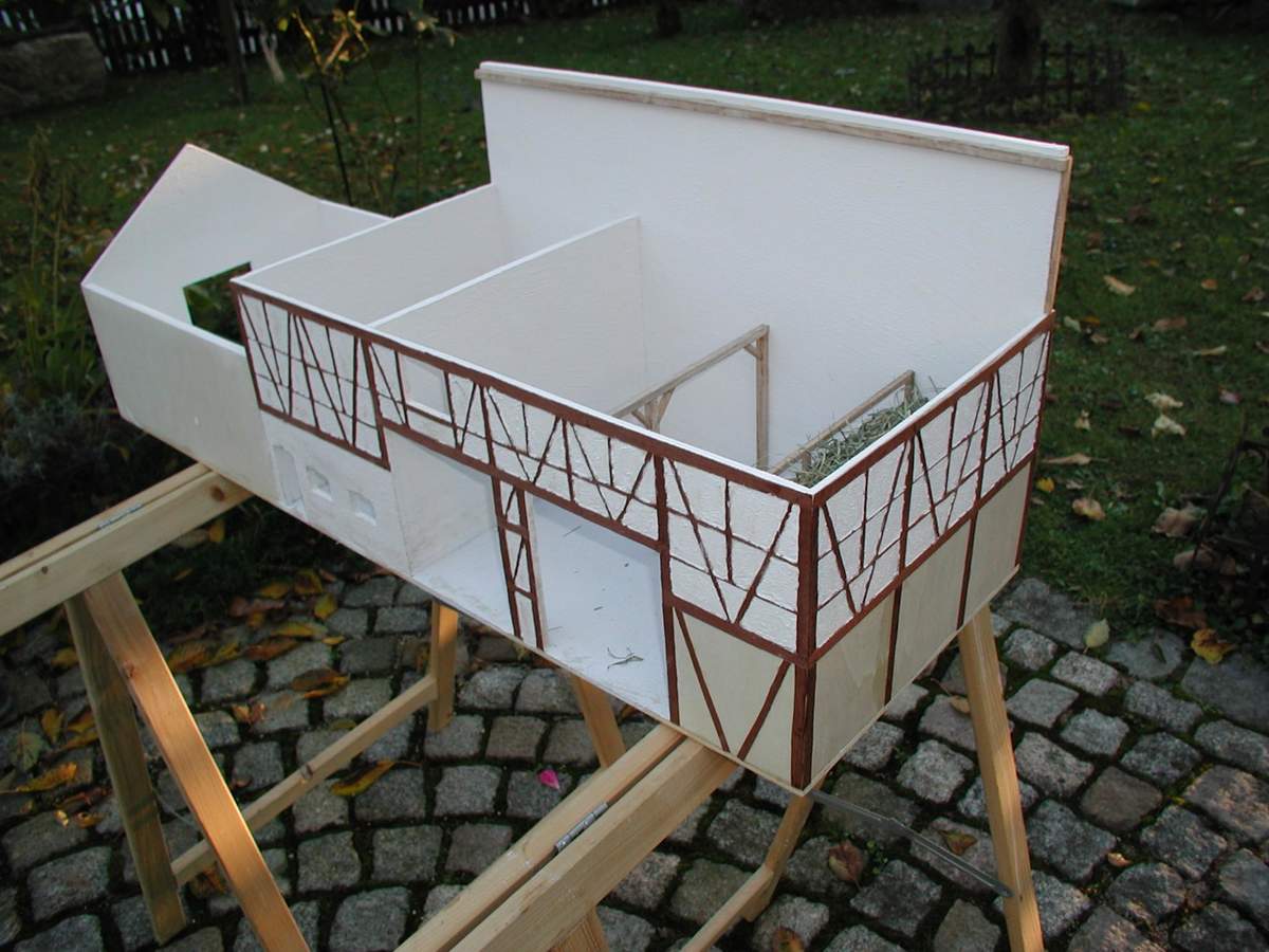 Also es soll ein Dreiseithof im Fachwerkstil werden, bei dem das hintere Gebäude, aus Platzmangel aufm Dio, nur in Halbrelief gebaut ist.