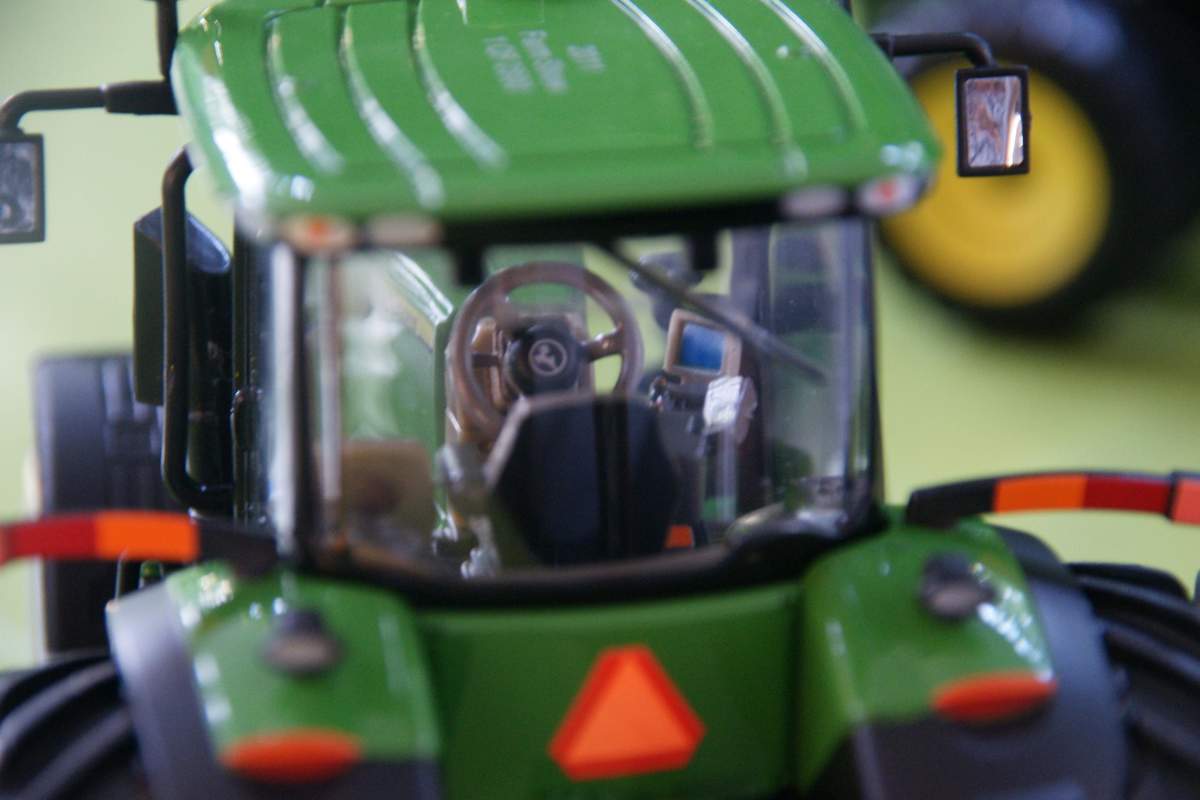 Die grüne Einfärbung von Metall und Kunststoff passen gut zusammen, die Lenkung geht sehr präzise, die HH ist, wie schon vom JD 8360R bekannt, voll Siku-kompatibel und aus Metall ausgebildet, der LimEd-Aufdruck auf dem Dach der Kabine sieht gut aus...
