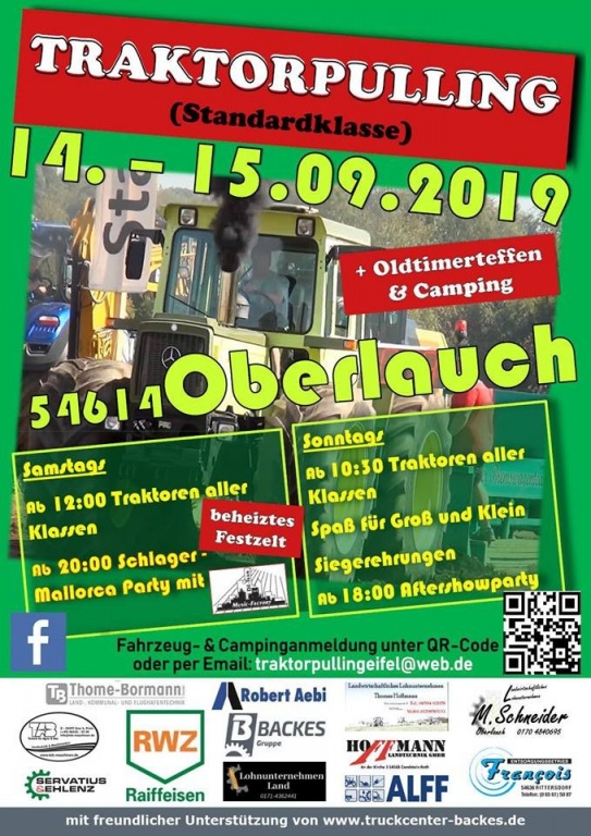 Am kommenden Wochenende 14./15.9. findet in Oberlauch( nähe Prüm/ eifel) das 1. Traktorpulling der Standardklasse statt Ich bin am Sonntag mit Stand dabei