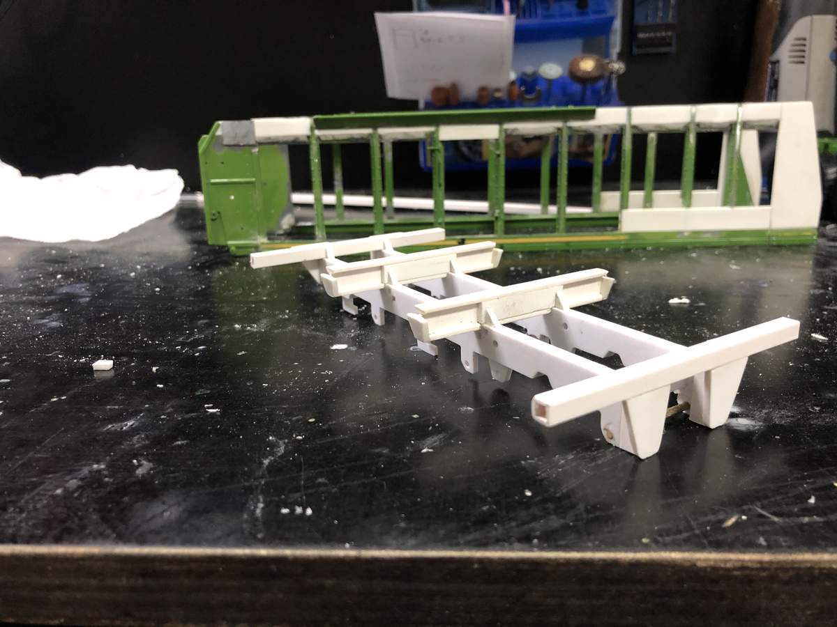 Dann fing ich mit dem Fahrwerk an , was natürlich in alle Richtungen Funktionieren musste , da ich die Keilform so klasse finde , wenn der wagen vorne abgesenkt wird , um das erntegut besser aufnehmen zu können .