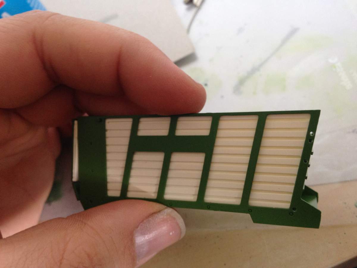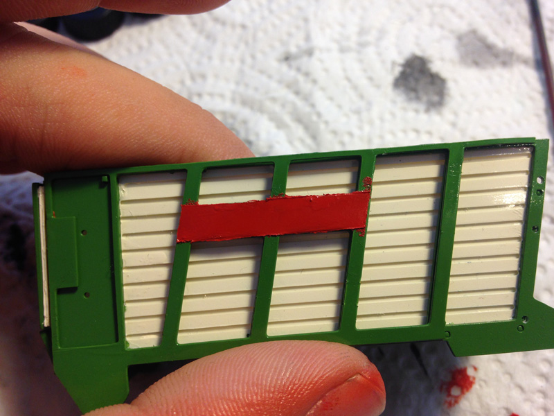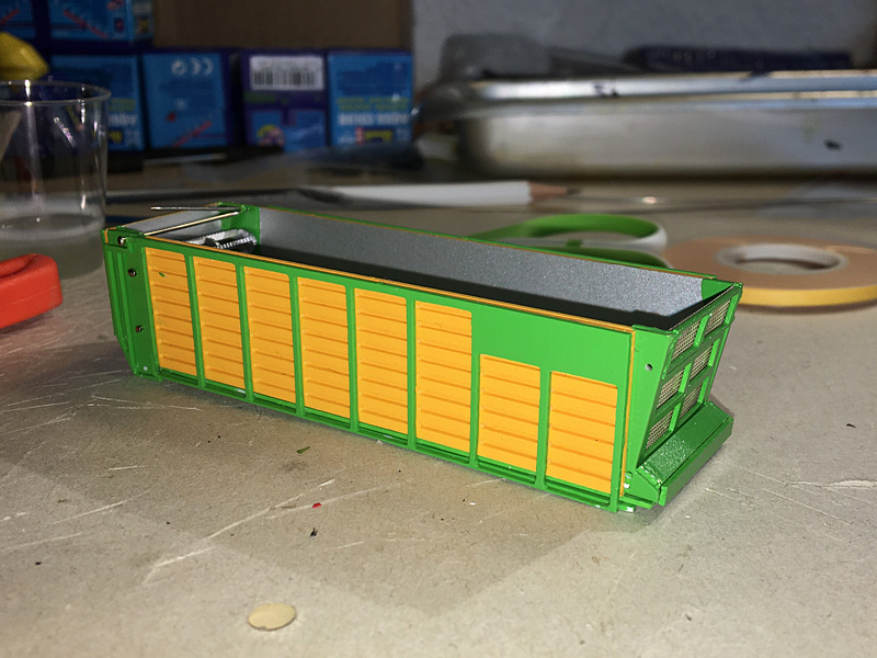 Nebenher hab ich hier Bergmann Silowagen von Trino liegen, die ich erstmal alle lackiert habe. Habe mit Spraydose gemacht und ich bin mit dem Ergebnis super zufrieden. Was meint ihr? Verwendet habe ich Bergmann-Grün und Creme-weiß. Leider habe ich nicht aufgepasst. Die Fläche wo später die Decals mit den Schriftzügen drauf kommen muss eigentlich rot lackiert werden.