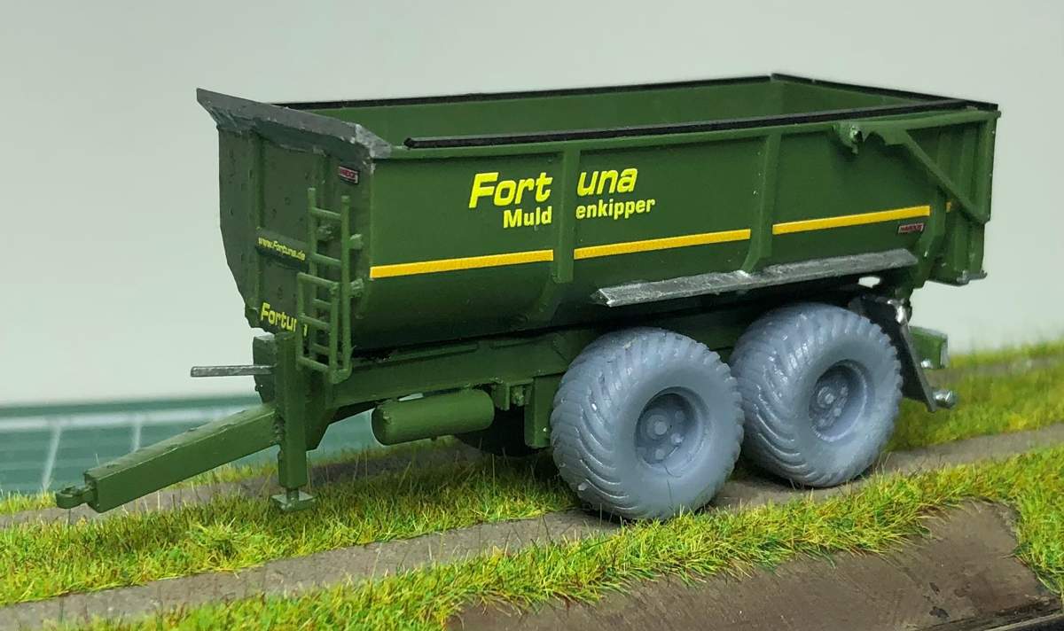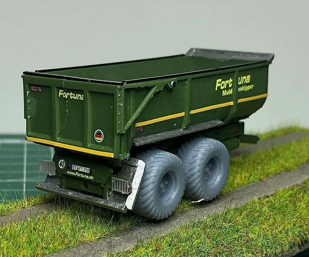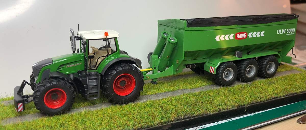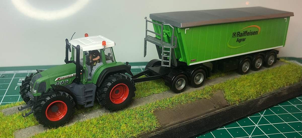 1x Fendt 926 mit Raiffeisen Mulde. Zum Modell -> umgebauter Wiking Fendt 930 mit der Haube von Trino und einigen hinzugefügten Details (Fahrer / Handgriffkabine / Rundumleuchte etc.....) . Die Mulde ist die Kempf von Herpa mit selbstgezeichneten Decals von mir.