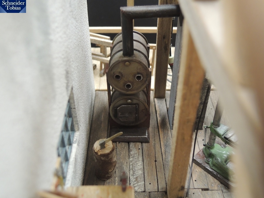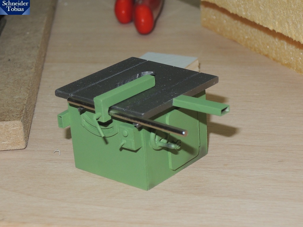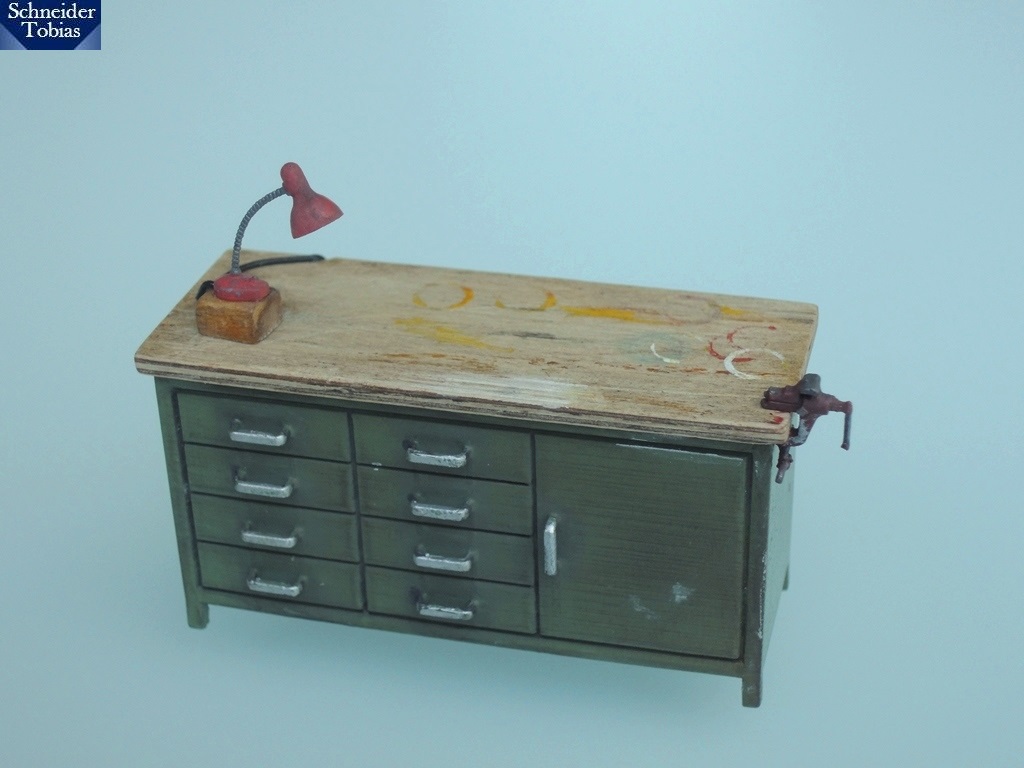 Die Werkbank ist inzwischen auch fertig. Der grün lackierte Kasten ist ein Druckteil. Lampe und Schraubstock stammen aus einem Bausatz.