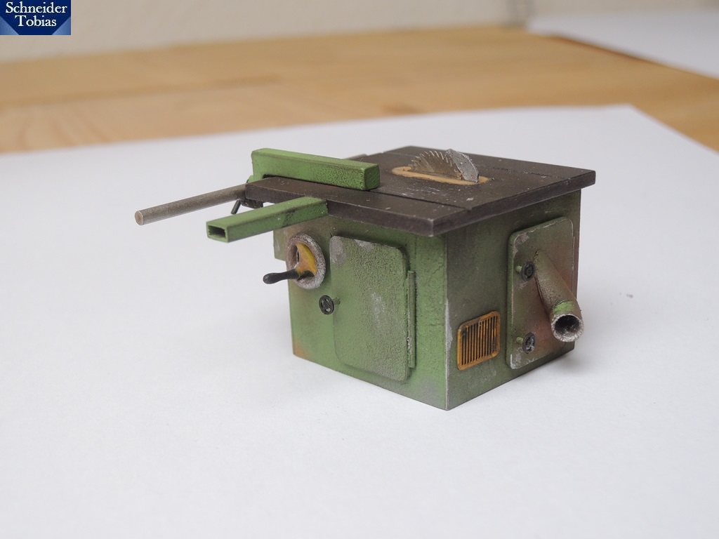 Danach setzte ich einige Details farblich ab und verpasste der Maschine eine dezente Alterung. Das Sägeblatt darf natürlich auch nicht fehlen.