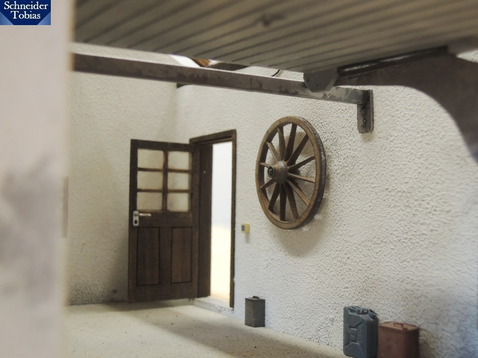 In der Garage kam auch noch ein Detail dazu. Im Original hing ein altes Wagenrad. Dieses ziert in 1:32 jetzt auch die Modellgarage.