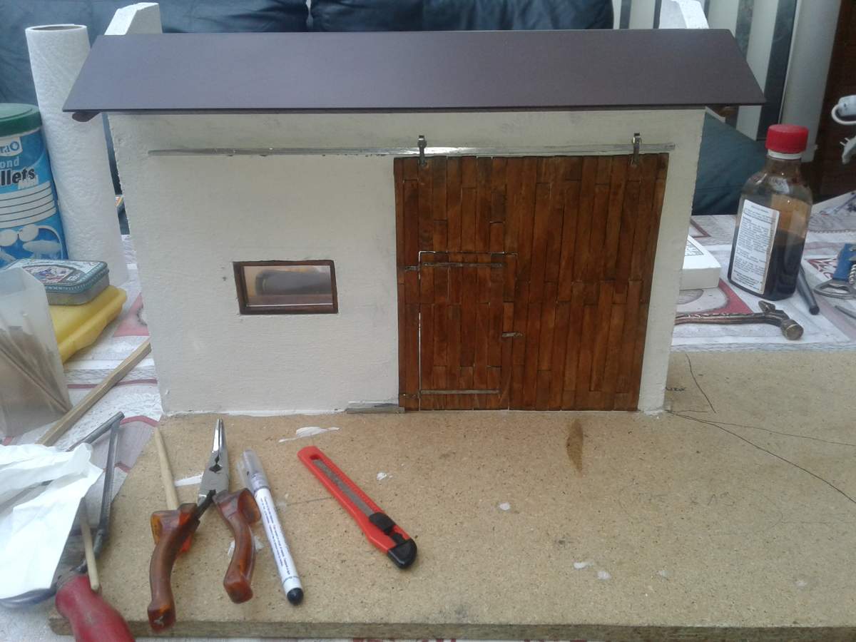 Ein angedeuteter Kuhstall mit Schiebetor, im vorne wird mit Acryl "gepflastert", so wie der kleine "Werkstatt " Bereich Seitlich.