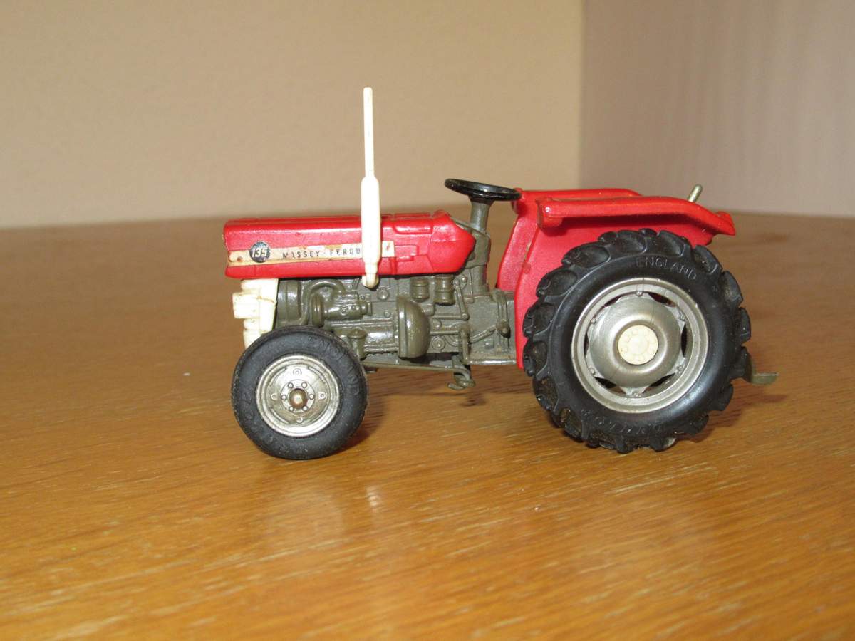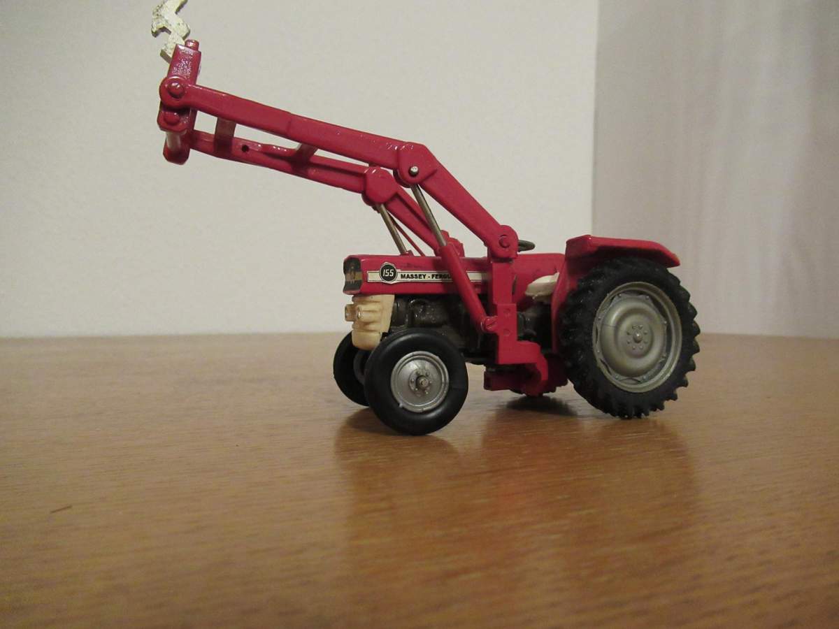 - MF 155 mit Frontlader, aus Britains MF 135 mit geänderter Hinterradbereifung, eigener Frontladerkonsole und Frontlader-Geräteaufnahme passend zum normalen Britains Frontlader. Der Frontlader vom MF 135 war ja ursprünglich an der Kabine befestigt und hatte fest eine Schaufel