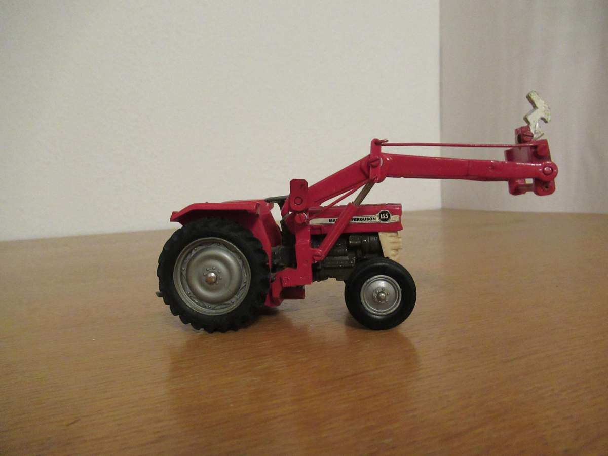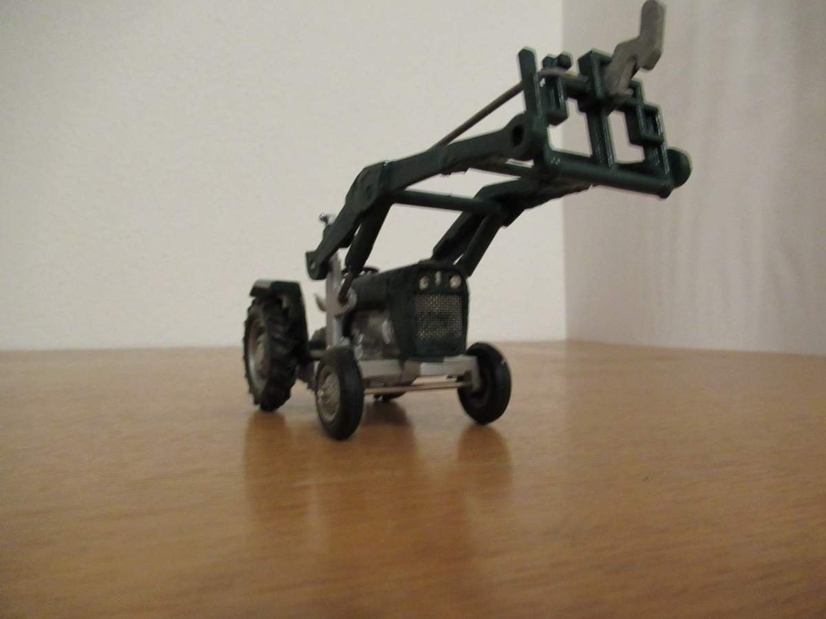 - MF 155 mit Frontlader, aus Britains MF 135 mit geänderter Hinterradbereifung, eigener Frontladerkonsole und Frontlader-Geräteaufnahme passend zum normalen Britains Frontlader. Der Frontlader vom MF 135 war ja ursprünglich an der Kabine befestigt und hatte fest eine Schaufel