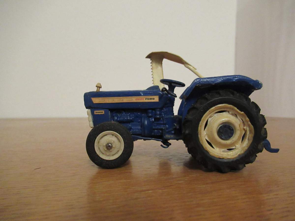- Ford Super Dexta 3000 (6x, also ein "pre-Force") mit Balkenmähwerk (aus Britains MF 135 mit "Gesicht" vom Ford 5000), Ladewagen Krone turbo 2500 (Eigenbau)