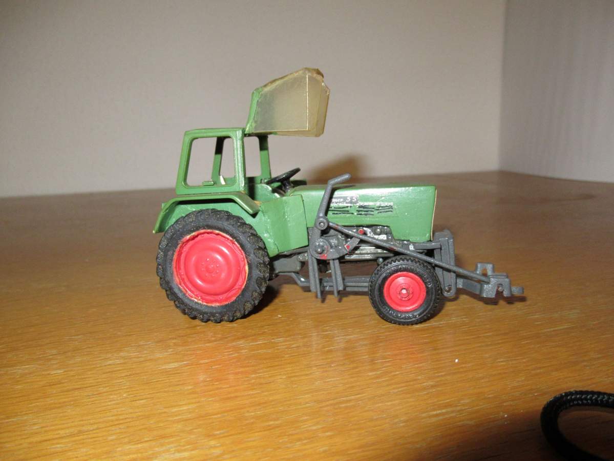 - Fendt Farmer 5 S (aus Britains Ford 5000) mit Peko-Verdeck und Fronthydraulik (gabs auf Wunsch ab Werk), Pöttinger Frontmähwerk (Eigenbau) und Pöttinger Erntewagen I (Britains)