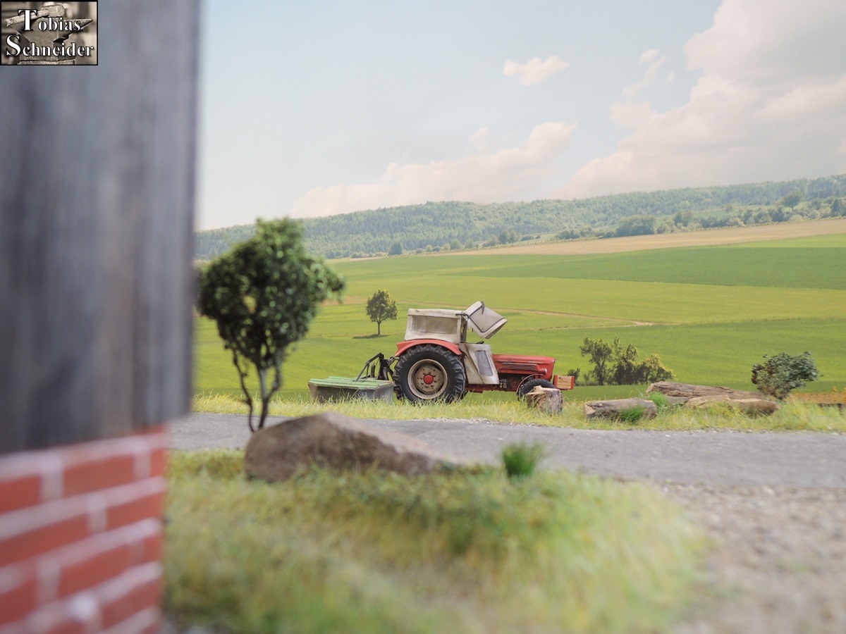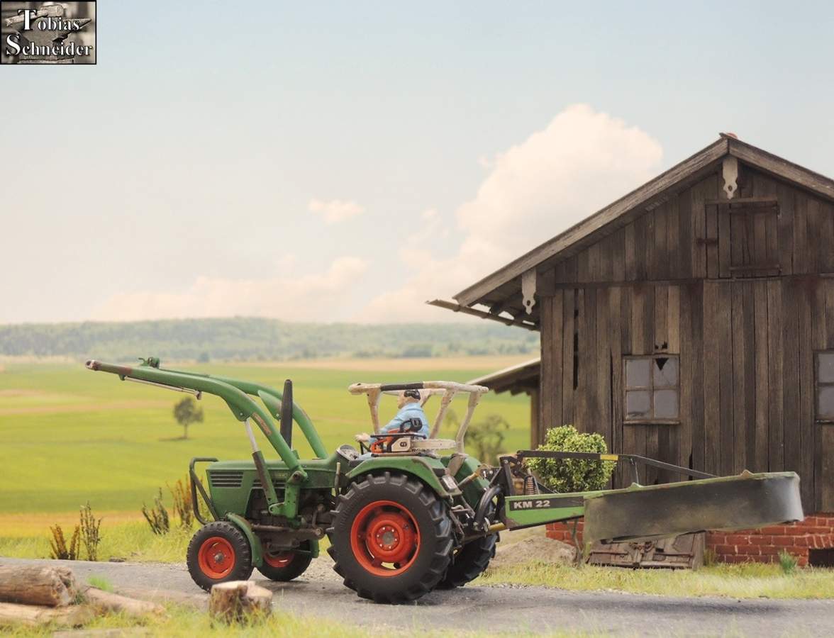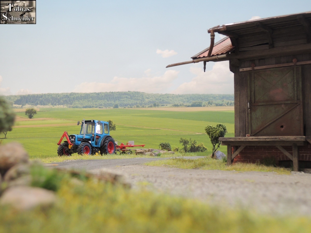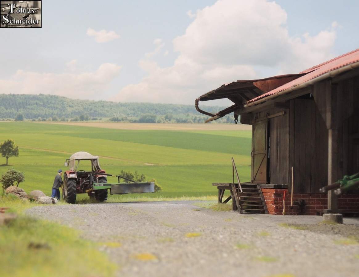 Als Sepp am Stadel angekommen war, fuhr er zuerst in den hinteren Bereich, um mit der Wiese am Bach zu starten.