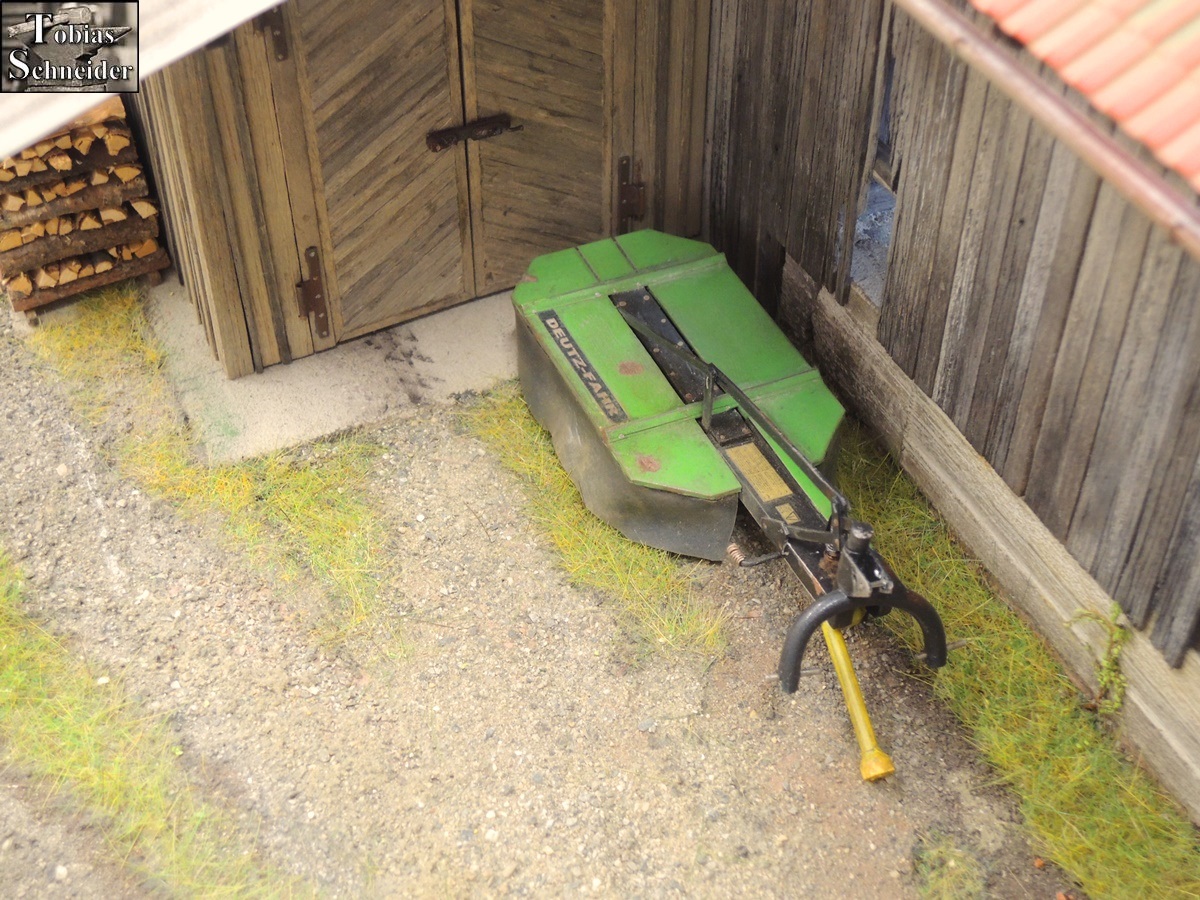 Währenddessen stattete Opa den Deutz mit Front- und Heckmähwerk aus und freute sich schon: "Meine guten roten Mähwerke und dazwischen der Deutz... Da wird der Sepp gleich schauen, wie ich des Gras mit geballter Power flachlege."