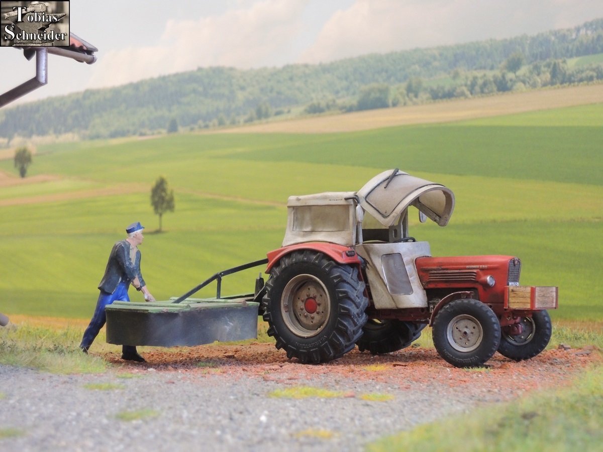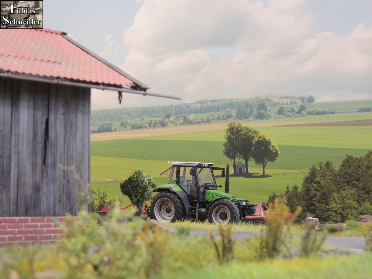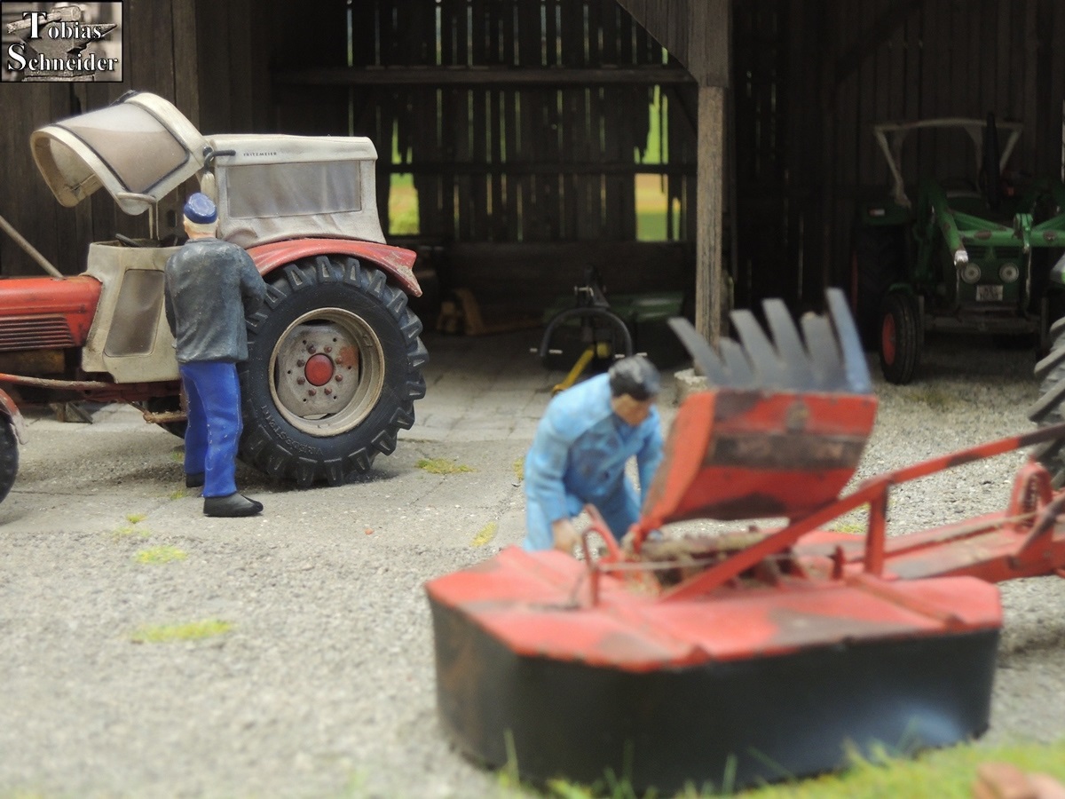 Währenddessen stattete Opa den Deutz mit Front- und Heckmähwerk aus und freute sich schon: "Meine guten roten Mähwerke und dazwischen der Deutz... Da wird der Sepp gleich schauen, wie ich des Gras mit geballter Power flachlege."