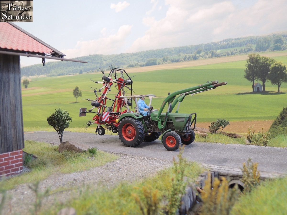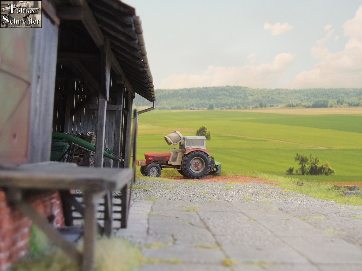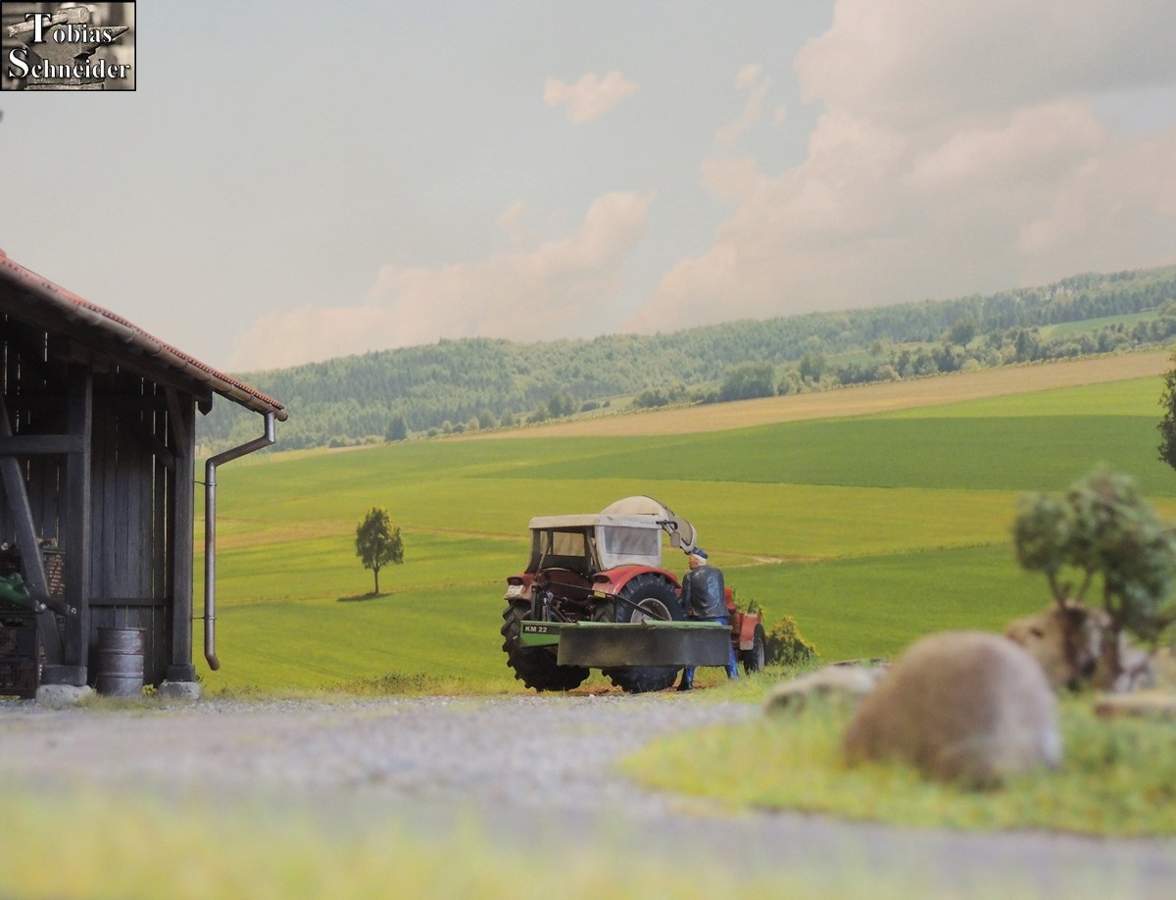 Als Sepp am Stadel angekommen war, fuhr er zuerst in den hinteren Bereich, um mit der Wiese am Bach zu starten.