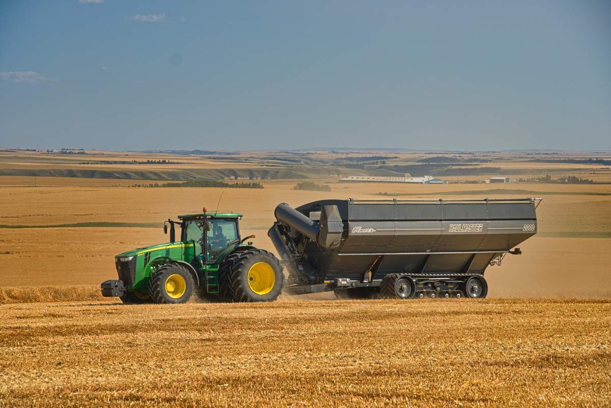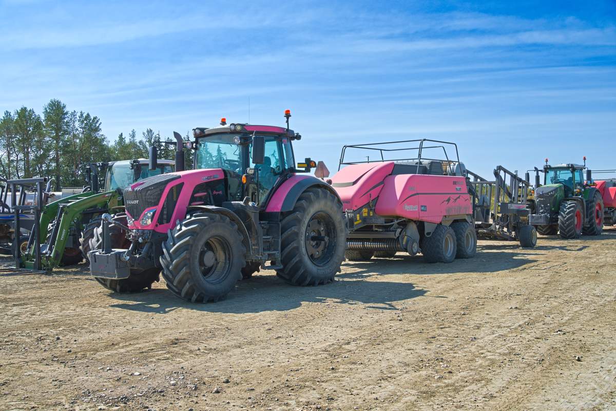 • Pressenflotte bei BarrAG in Olds, Alberta. Dort sind um die zehn Pressengespanne unterwegs. Der Pinkfarbene ist für die Tochter.