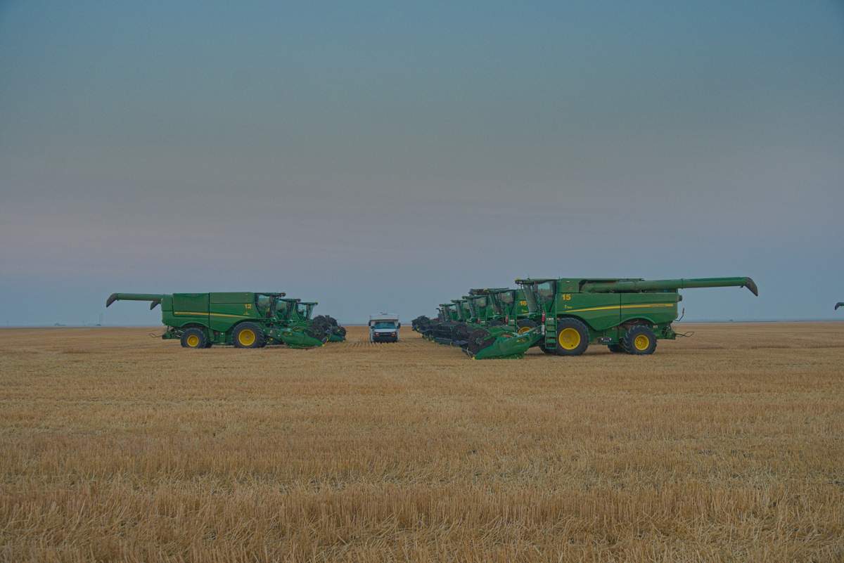 17 Drescher kümmerten sich um die Ernte, 7 Abfahrer (davon war einer außer Gefecht) lieferten das Getreide zu unzähligen Trucks am Feldrand.