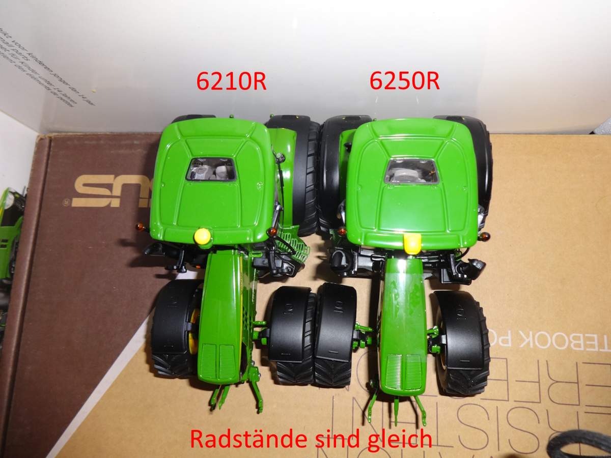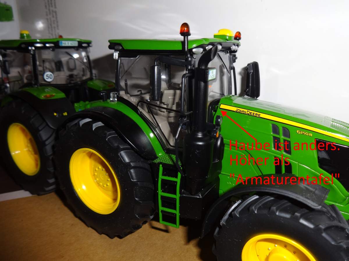 Ich habe auf die schnelle mal ein paar Vergleichsfotos der beiden Wiking 6R gemacht und einen Ausschnitt eines realen 6250R (Bild von mir, Vorführer bei einem Betrieb im Nachbardorf) mit angefügt. Das sollte man es ganz gut erkennen.