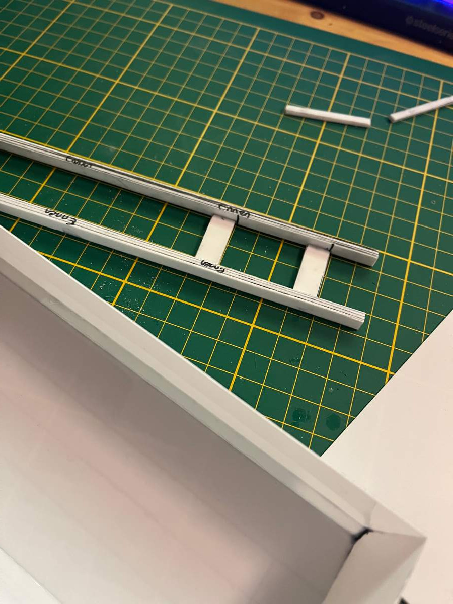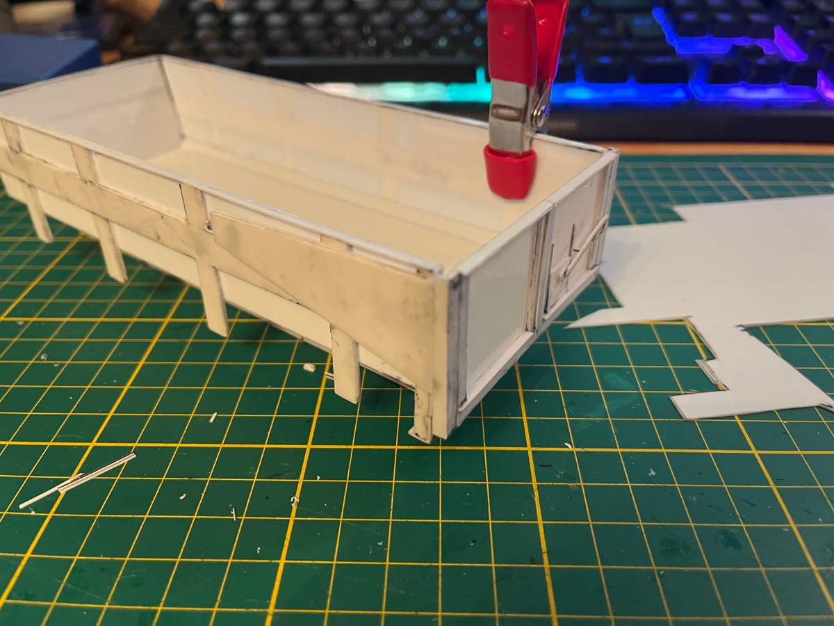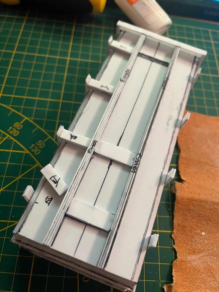 -Aktueller Stand: Grundlage der Kiste ist fertig, hintere Verstrebung fertig, seitliche Verstrebung einseitig fertig, untere Längsverstrebung fertig, bis auf "Scharnier" des Kippers, Querverstrebung WIP