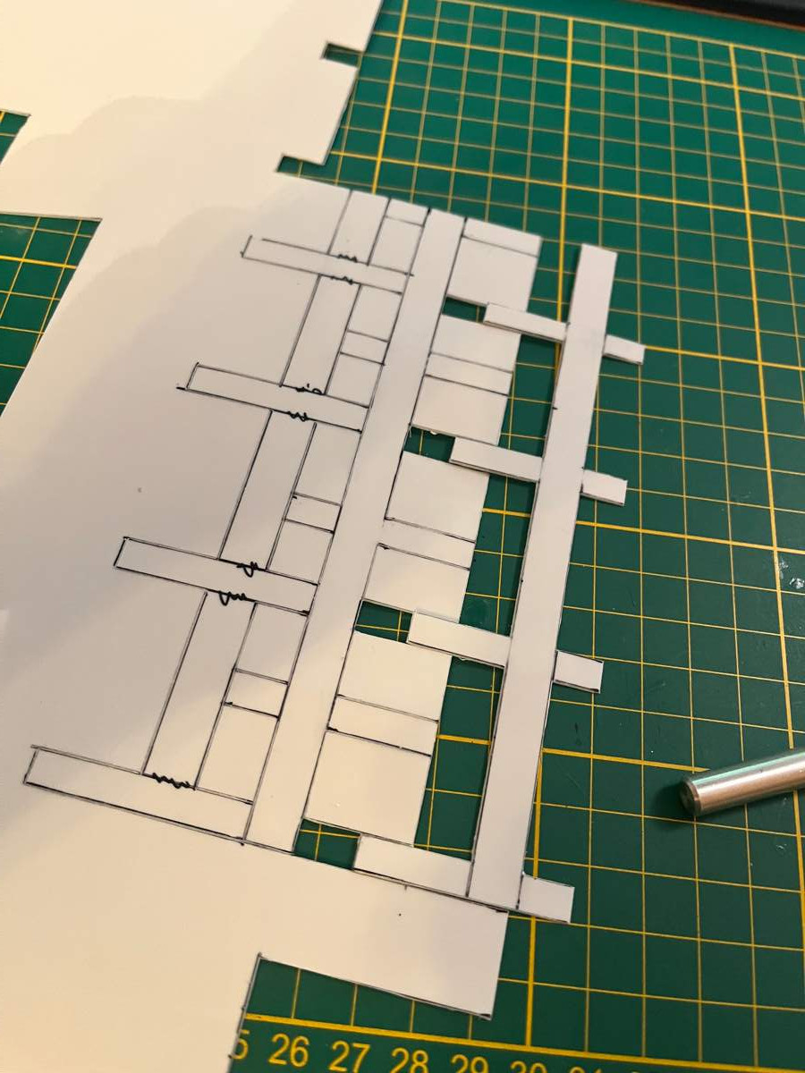 Nächster Punkt war auf der Unterseite, die Verlängerung der seitlichen Vertikalstreben. Auch hier wieder ohne Profile, also ein paar Schichten Polystyrol aufeinander geklebt. direkt in 8,5cm länge und dann zurecht geschnitten und gefeilt. Ein Teilchen hat etwa 1,9cm, also noch genug Spielraum zum krumm schneiden und wegfeilen.