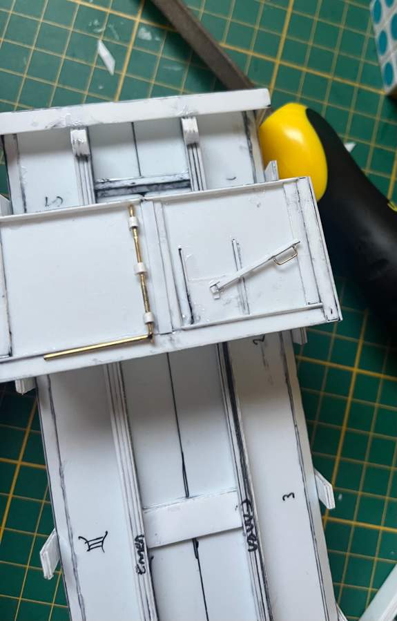 Gleiches gilt für die die Streben nach unten hin - die sind auch noch ein wenig zu lang. Die werden auch noch kurzgefeilt, wenn die unteren Streben montiert sind. Hat einerseits den Grund, dass es in der Realität die Seitenstreben die Streben unter dem Kipper verdecken, andererseits eben meine Präzisionsprobleme.