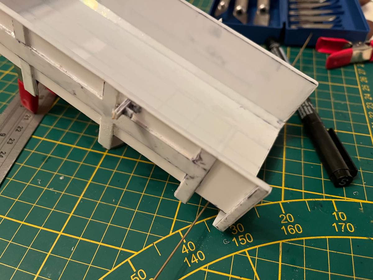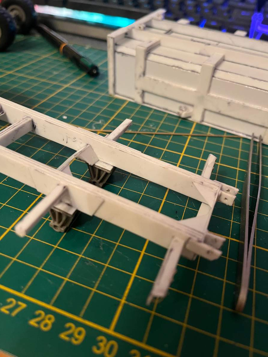-Aktueller Stand: Grundlage der Kiste ist fertig, hintere Verstrebung fertig, seitliche Verstrebung einseitig fertig, untere Längsverstrebung fertig, bis auf "Scharnier" des Kippers, Querverstrebung WIP