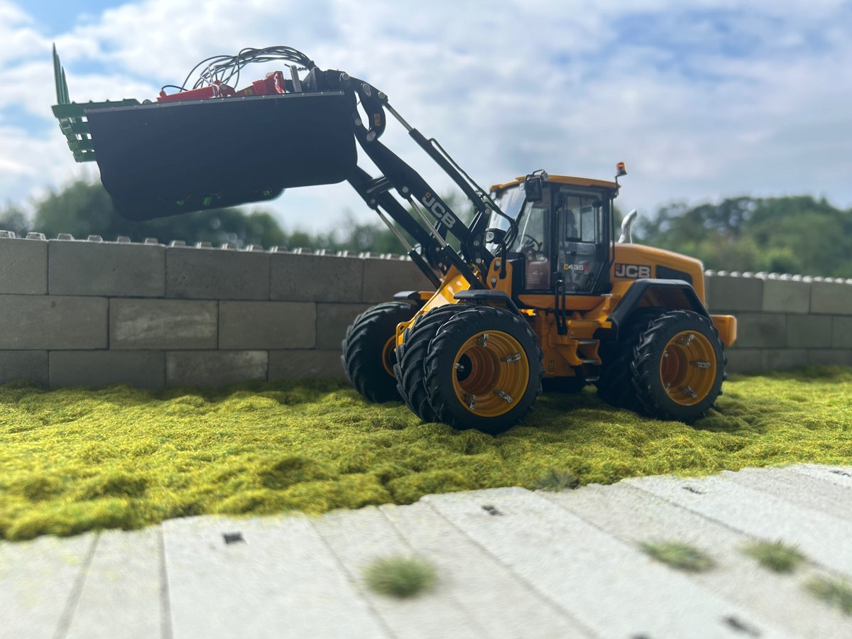 Wir haben unseren JCB 435 S Agri wieder mit Zwillingsreifen ausgestattet und einen Holaras Jumbo Siloverteiler angebaut damit wir auch in Fahrsilos verteilen können.
