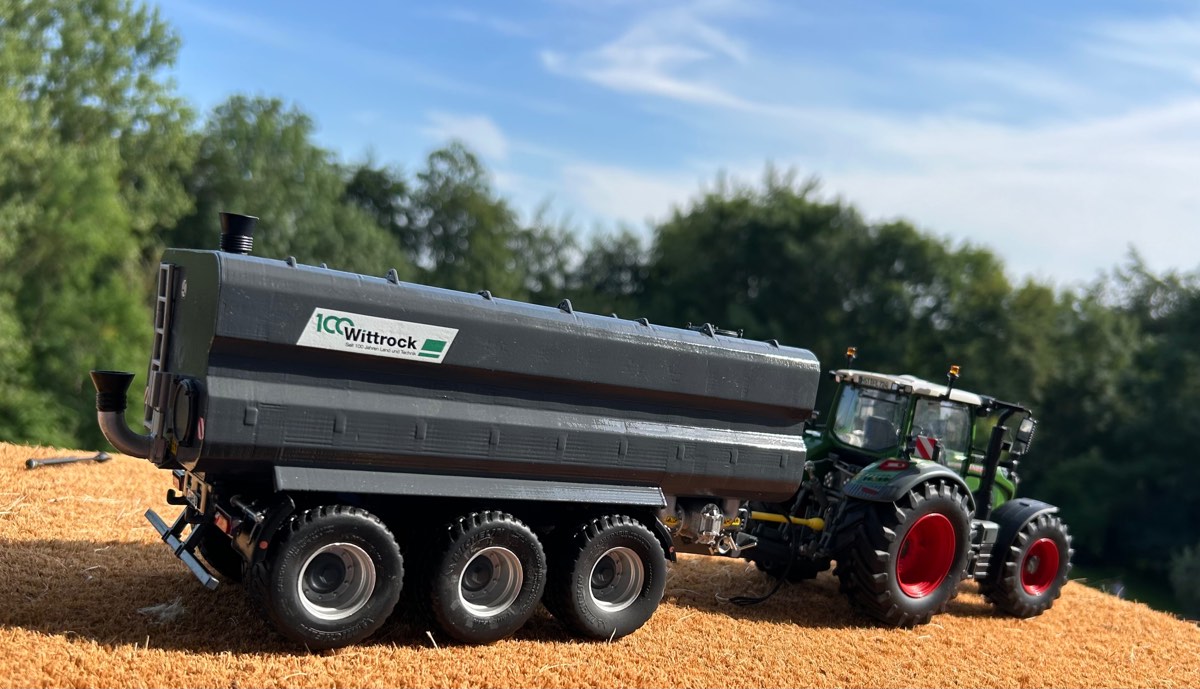 Da kommt unser neuer Zubringer der Firma Wittrock Landtechnik ins Spiel. Er fasst maximal 26 m3 und kann bequem auf der Straße und dem Feld eingesetzt werden , da er mit seinen breiten Reifen bodenschonend unterwegs ist.