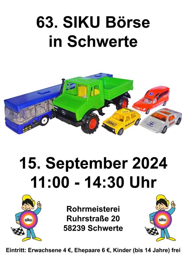 9. September 2024 um 22:48 #1 Am Sonntag, 15. September 2024 findet in der Rohrmeisterei Schwerte die 63. SIKU Börse statt.Rohrmeisterei SchwerteRuhrstr.258239 Schwerte