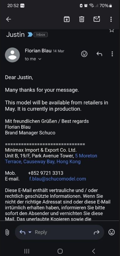 Einmal editiert, zuletzt von James Schottland (1. April 2025 um 22:41) aus folgendem Grund: Vielen Dank für Ihre Nachricht. Das Modell ist ab Mai im Handel erhältlich und befindet sich derzeit in der Produktion.