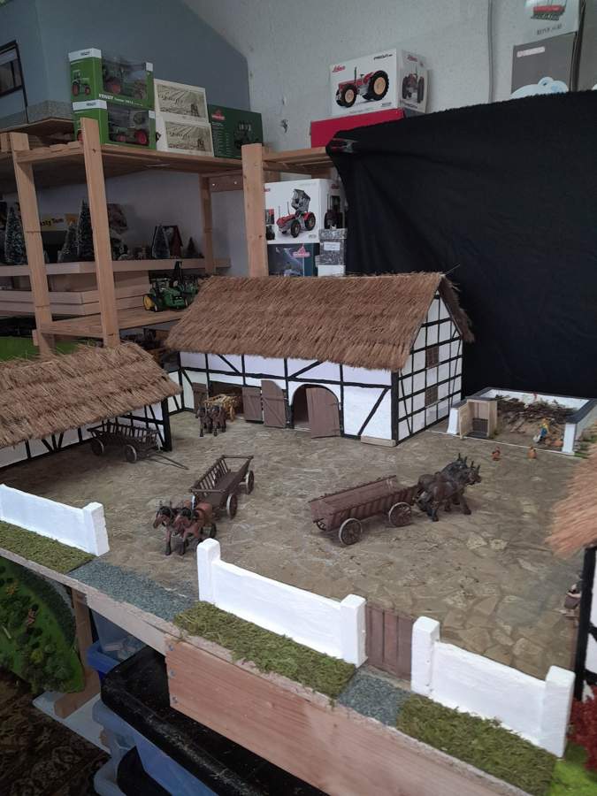 Im Flußbett kommen noch kleine Kieselsteine bevor das Gießharz eingefüllt wird. Nun zu der hellen Mauer. Diese ist inzwischen auch braun.Sie diehnt als Stützmauer für ein Müllrad. Über die beiden Mauern geht die Hauptachse in ein Gebäude und treibt einen Schmiedehammer an.Hier soll noch eine kleine Schmiede mit Werkstatt und ein offener Schuppen entstehen. Dort werden dann die vom Pferd gezogenen Maschinen auf Traktorzug umgebaut.