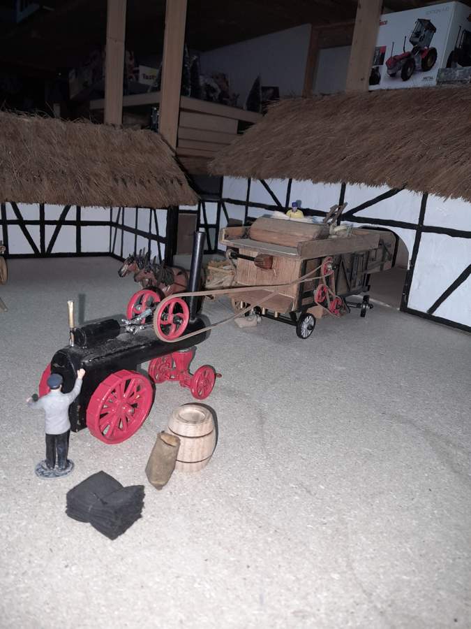 Es werden zwei Höfe gebaut wovon einer schon gut vorangegangen ist. Auf dem ersten soll noch alles mit Pferd und Karren und vielen Personen gemacht werden und auf dem zweiten wird schon alles weitgehend mit Traktoren und auf Traktoren umgebaute Maschinen, die vorher vom Pferd gezogen wurden,gemacht