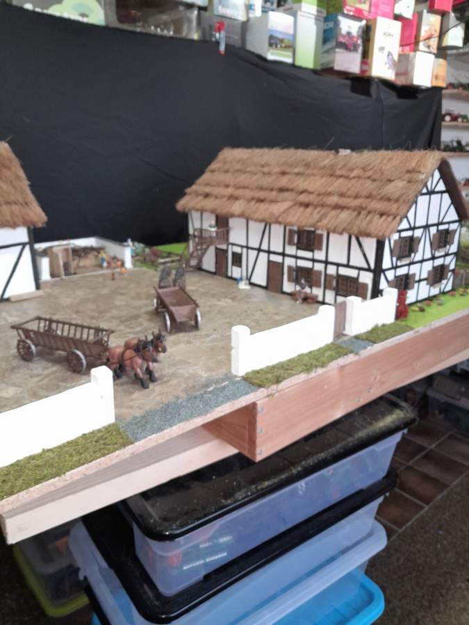 Mir ist durchaus bewusst, dass Getreide nicht in Büschen wächst aber einzelne Borsten zu kleben war dann doch zuviel. Und mit der Kokosmatte passte mir auch nicht wirklich. Somit habe ich diese Lösung gefunden. Das Pferd bekommt noch Zaumzeug. Mit dem Ableger wurde gemäht und die blauen Streben waren hochgeklappt wodurch sich ein Haufen Getreidehalme sammelten. Wenn es genug für eine Garbe war wurde runtergeklappt und das Bündel glitt über die Stoppeln von selber ab. Dann kamen die vielen fleißigen Hände die das Bündel noch zu einer Garbe gebunden haben.