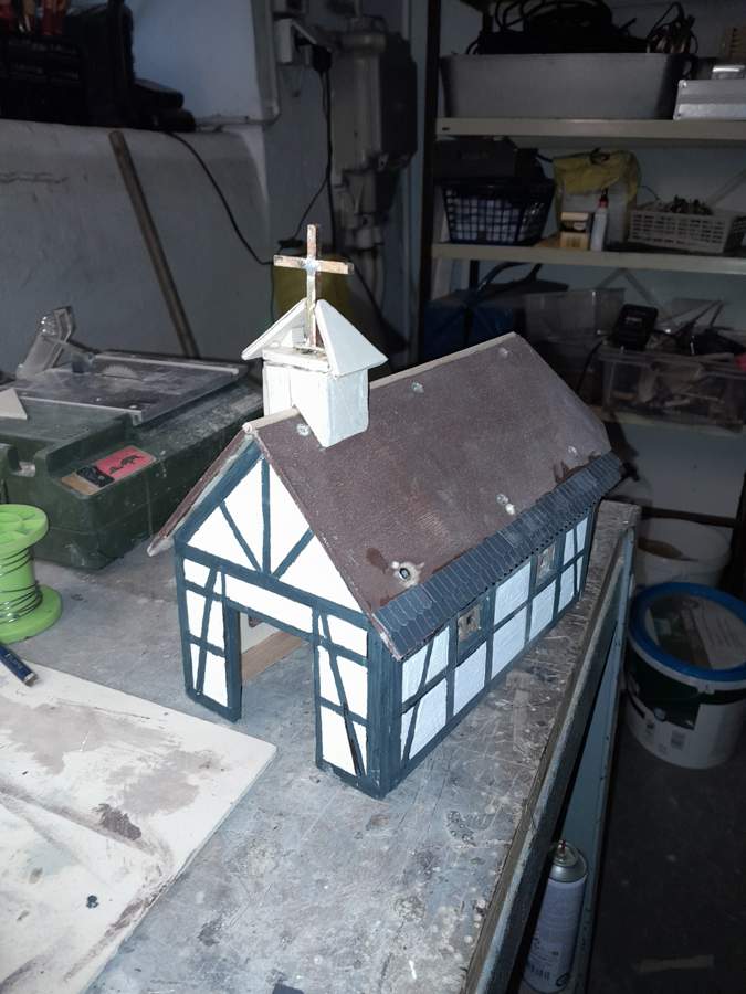 War garnicht so einfach mit den Gärungen im Dach und den Schindeln von Juweela die Dachfläche zu bekleben.auch der Glockenturm hatte es in sich. Da konnte man teilweise am Tag nur eine Reihe kleben damit der Rest nicht verrutschte. Weiterhin wurde die gesamte Dachfläche mit mattgrauer Farbe gestrichen wodurch der Plastikefekt der Schindeln aufgehoben wurde