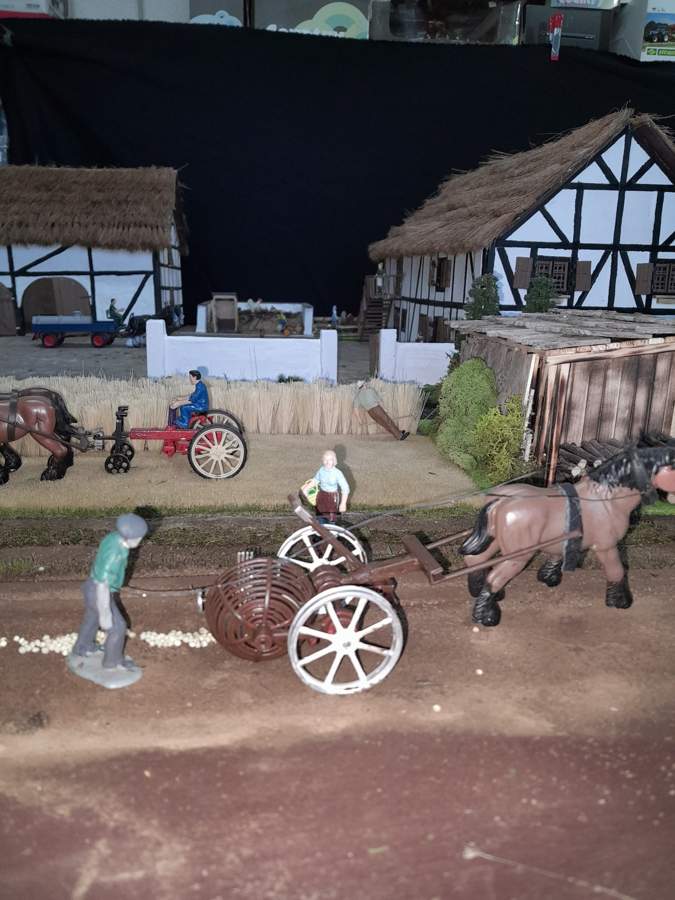Mir ist durchaus bewusst, dass Getreide nicht in Büschen wächst aber einzelne Borsten zu kleben war dann doch zuviel. Und mit der Kokosmatte passte mir auch nicht wirklich. Somit habe ich diese Lösung gefunden. Das Pferd bekommt noch Zaumzeug. Mit dem Ableger wurde gemäht und die blauen Streben waren hochgeklappt wodurch sich ein Haufen Getreidehalme sammelten. Wenn es genug für eine Garbe war wurde runtergeklappt und das Bündel glitt über die Stoppeln von selber ab. Dann kamen die vielen fleißigen Hände die das Bündel noch zu einer Garbe gebunden haben.