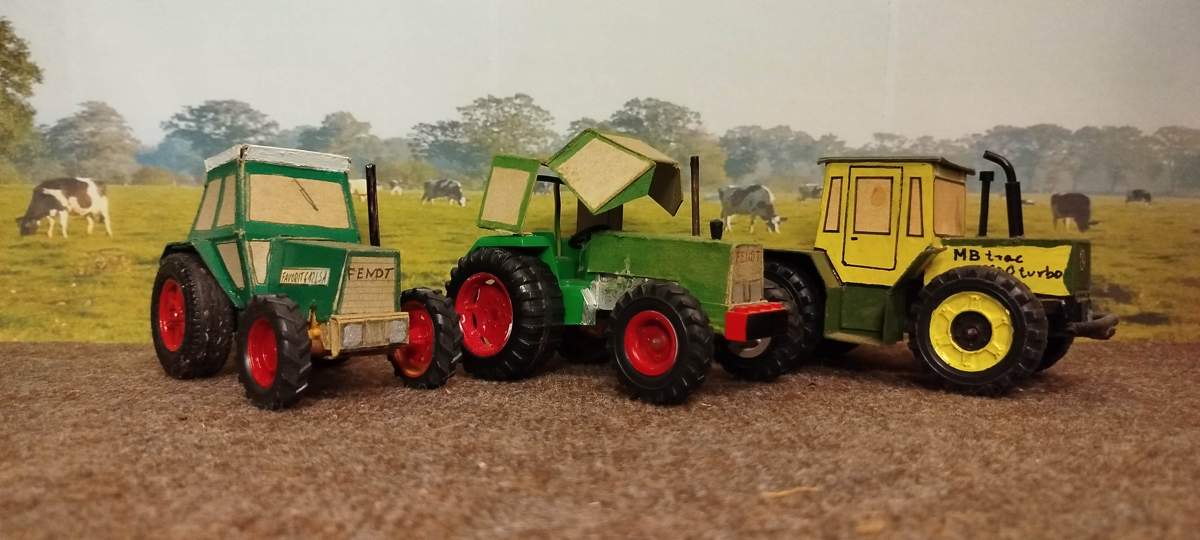 Einmal der Fendt Farmer , Fahrgestell war von einem NoName Plastik Traktor, Haube und Verdeck aus Pappe, sowie einen Gewichtstück von Lego.
