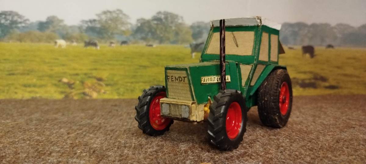 Dann ein Fendt Favorit 612 LSA, Fahrgestell ebenfalls von einem NoName Plastik Traktor, Haube und Kabine wieder aus Pappe 😎