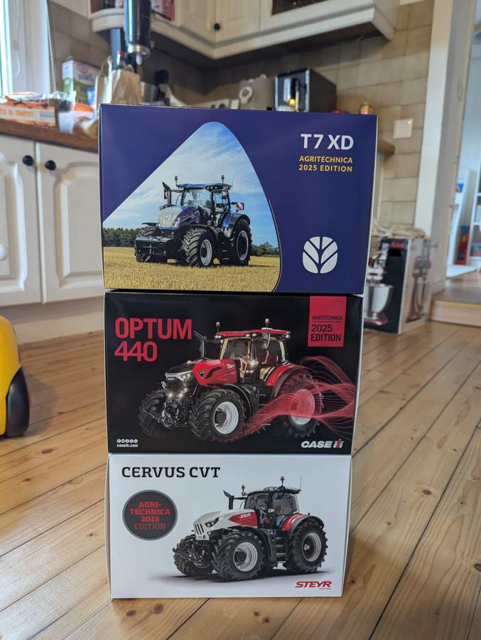 So habe ich mir auch je einen Claas 9.450 matt schwarz, Claas Axion 9.450 TT matt schwarz, NH T7.440 XD, Case Optum 440 und Steyr 6.440 CVT sichern können.![]()
